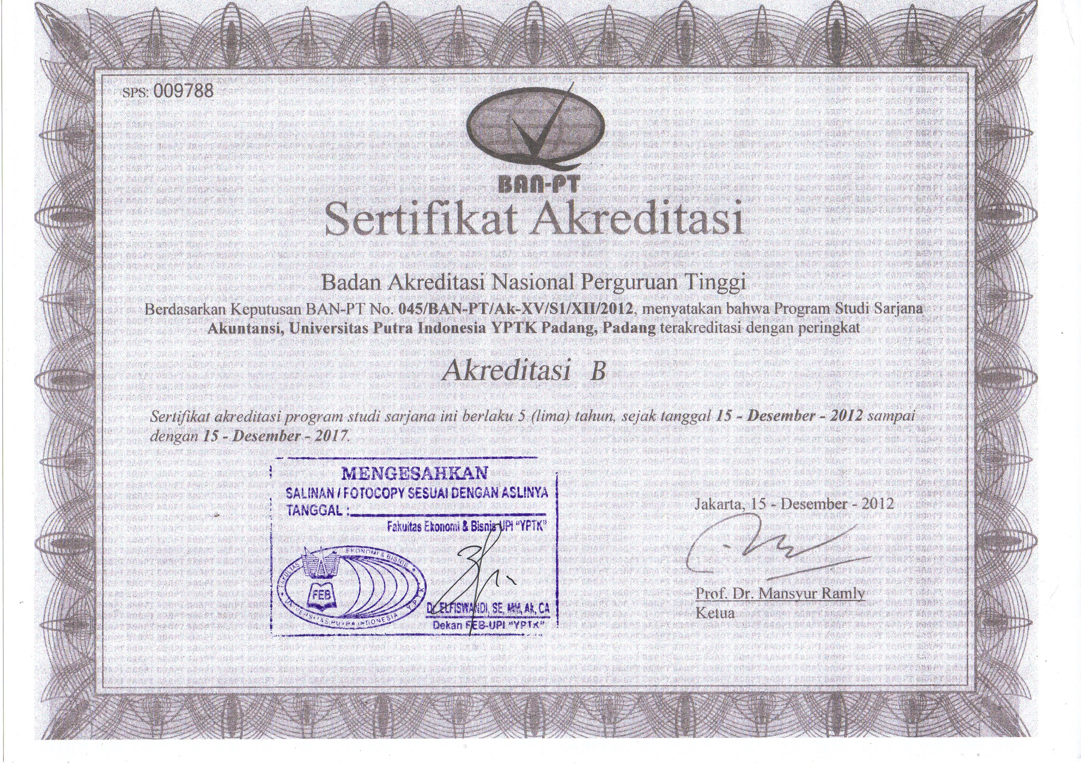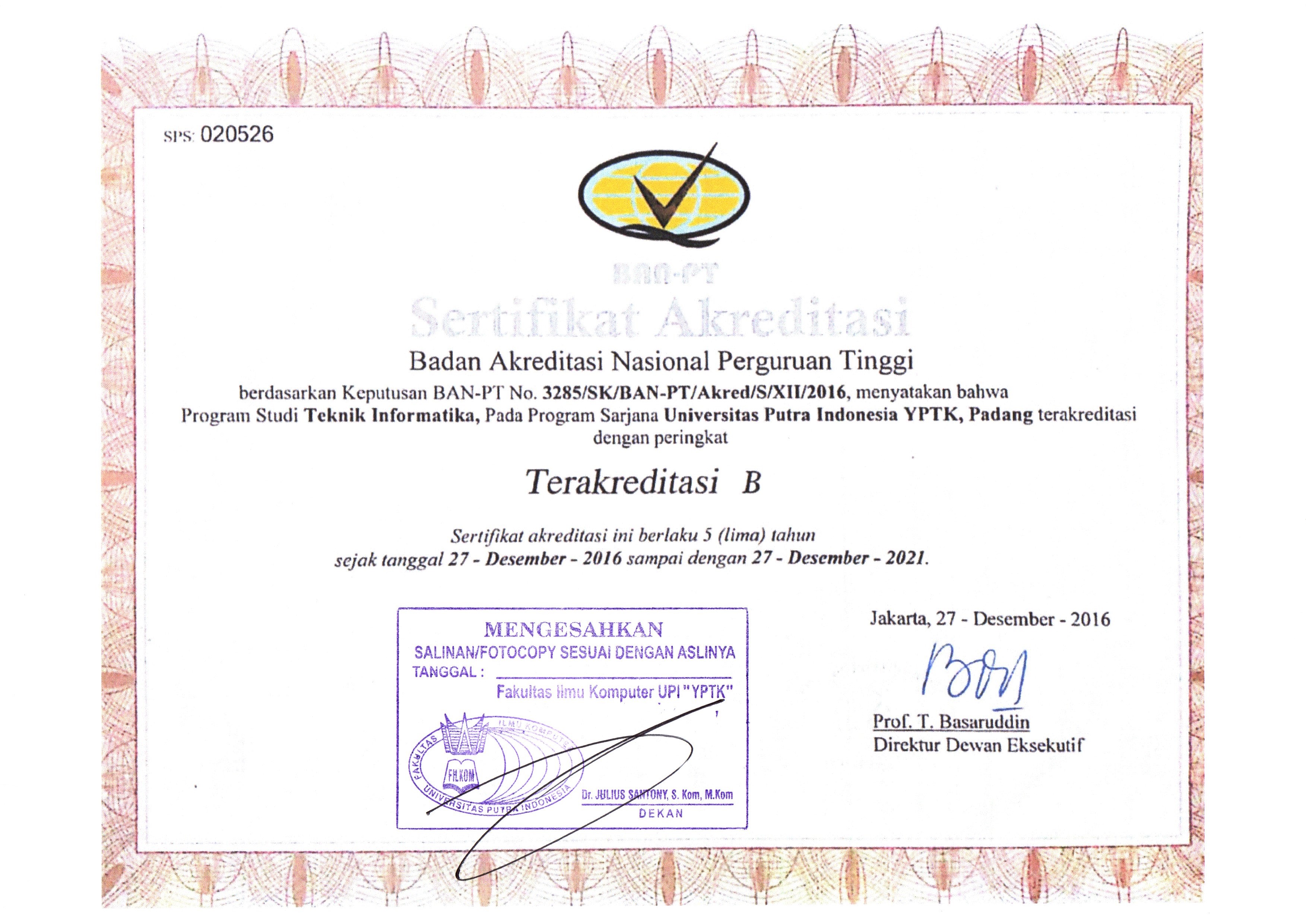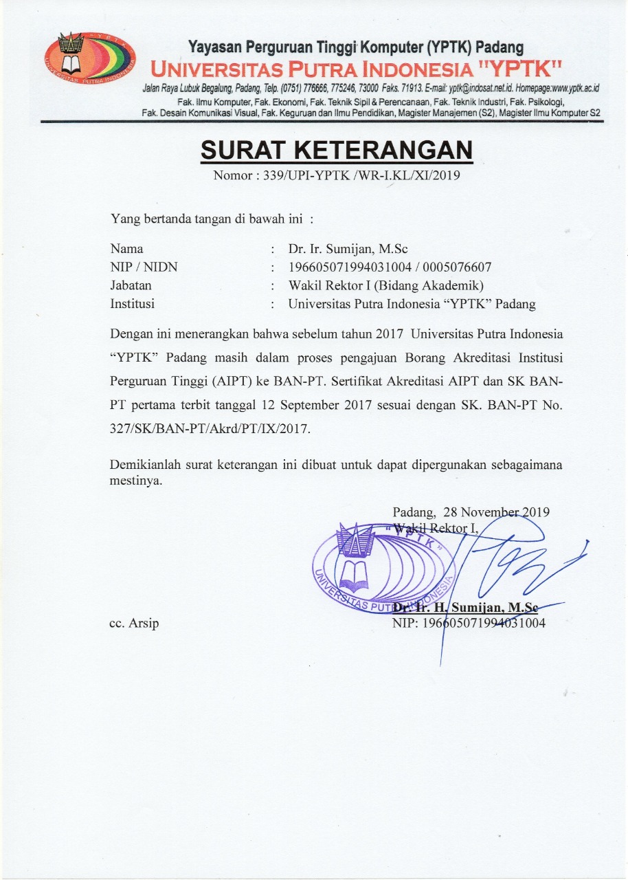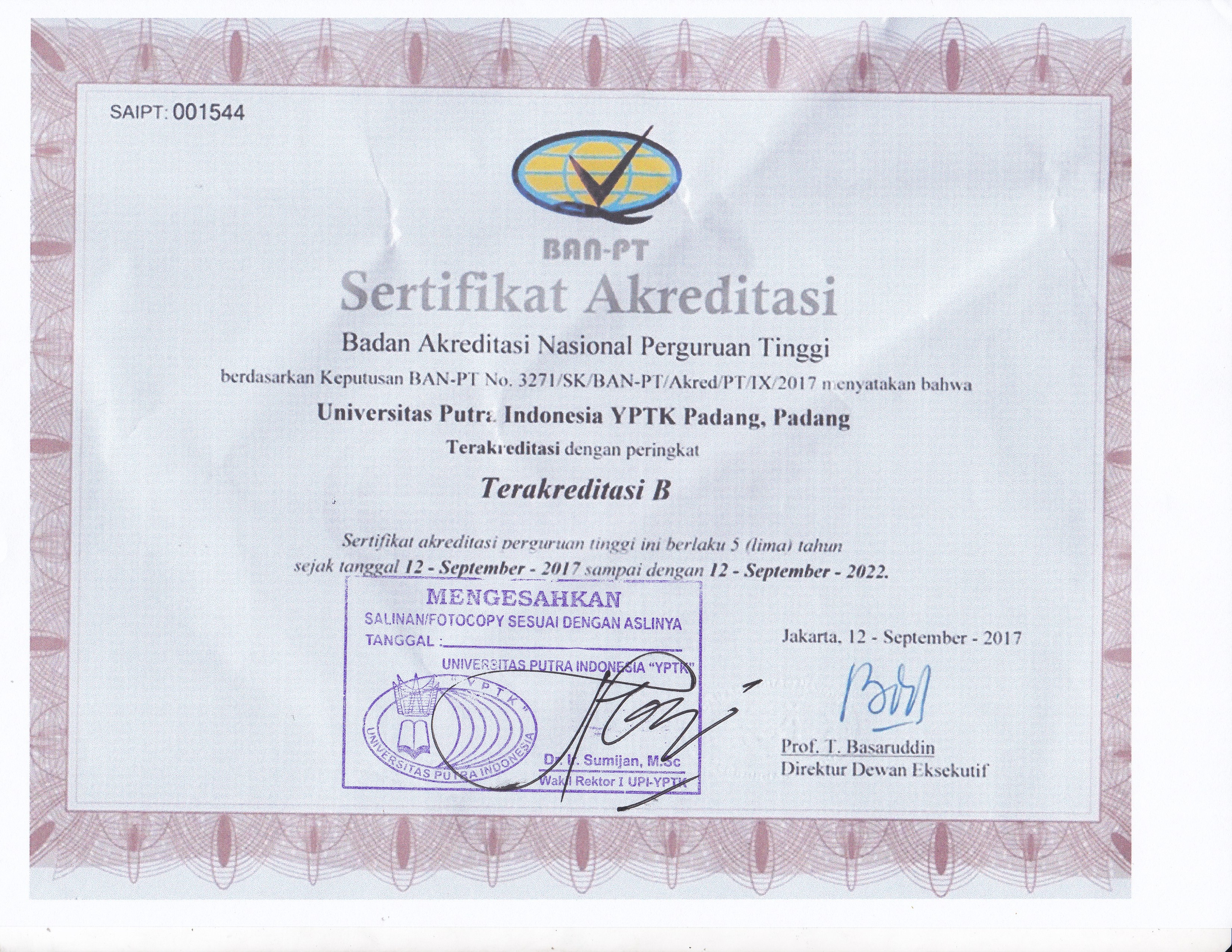 Sertifikat Akreditasi - Universitas Putra Indonesia (YPTK) Padang