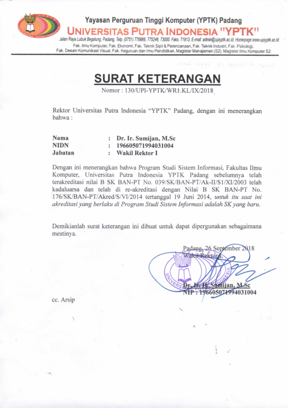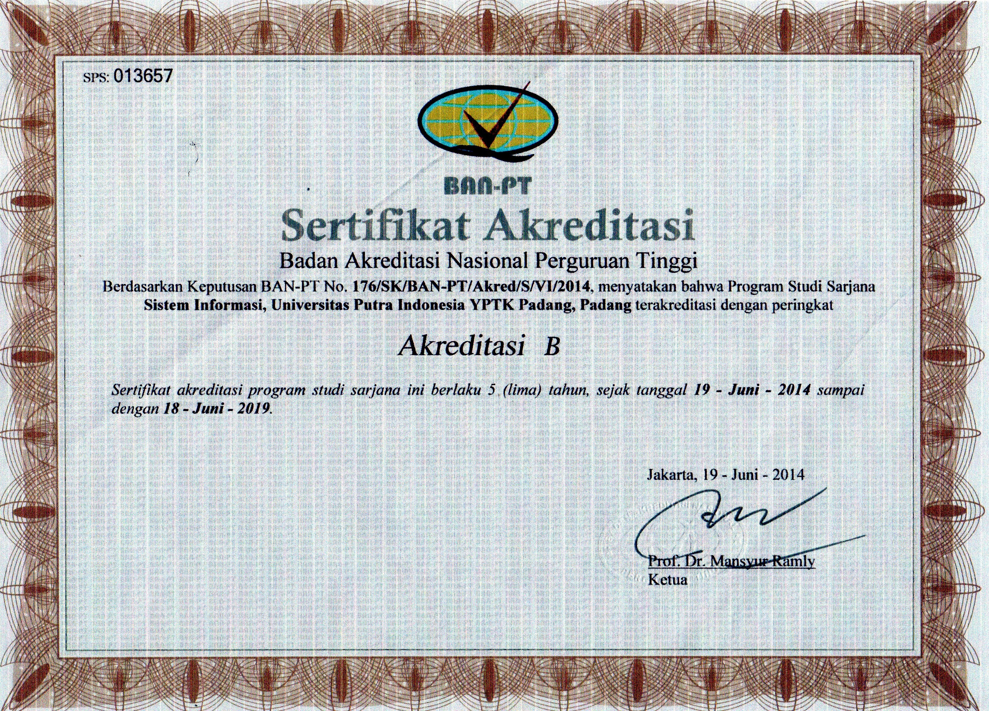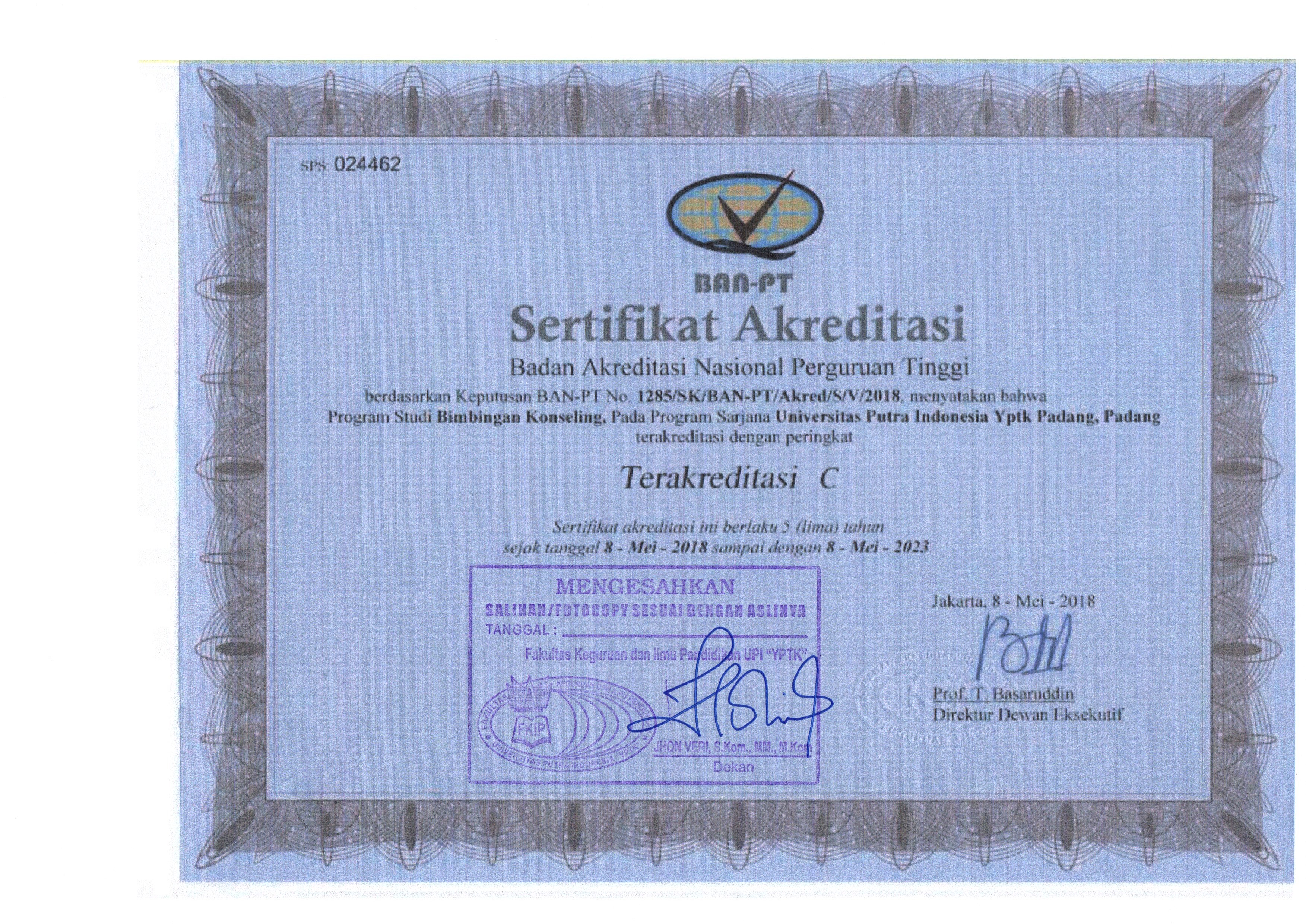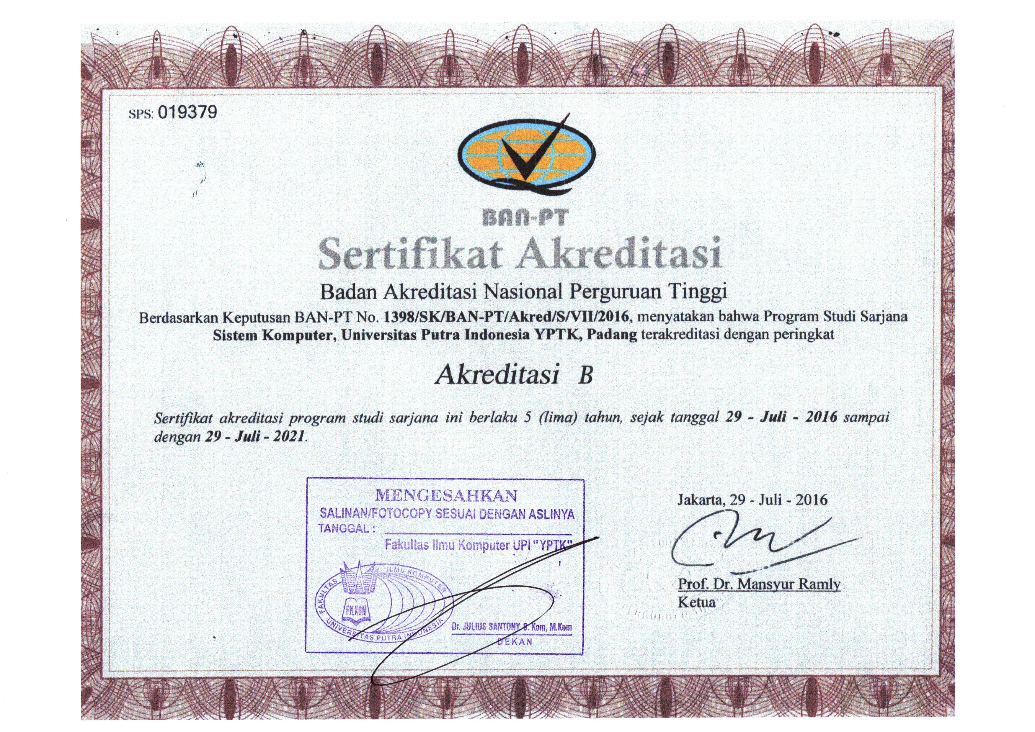 Sertifikat Akreditasi - Universitas Putra Indonesia (YPTK) Padang