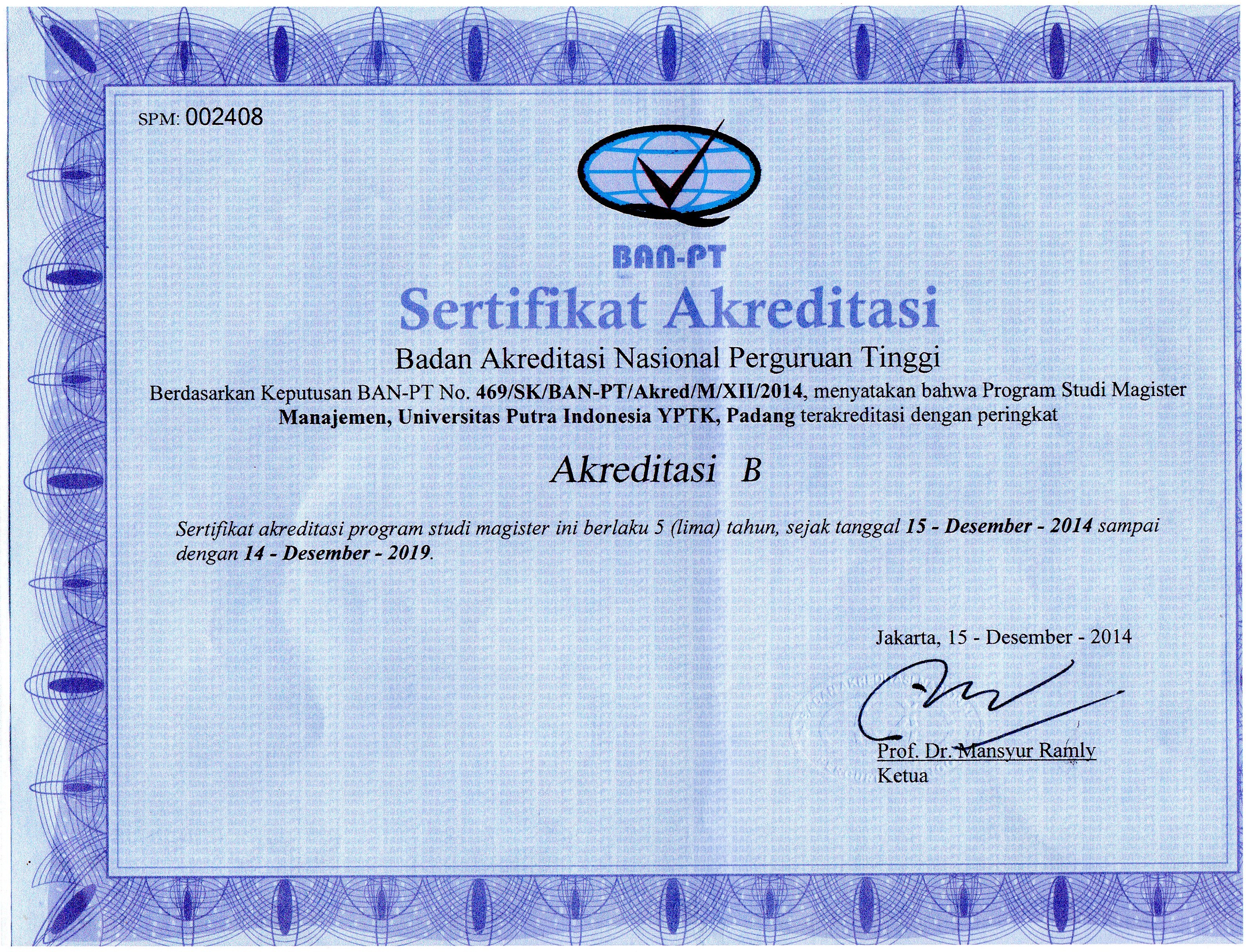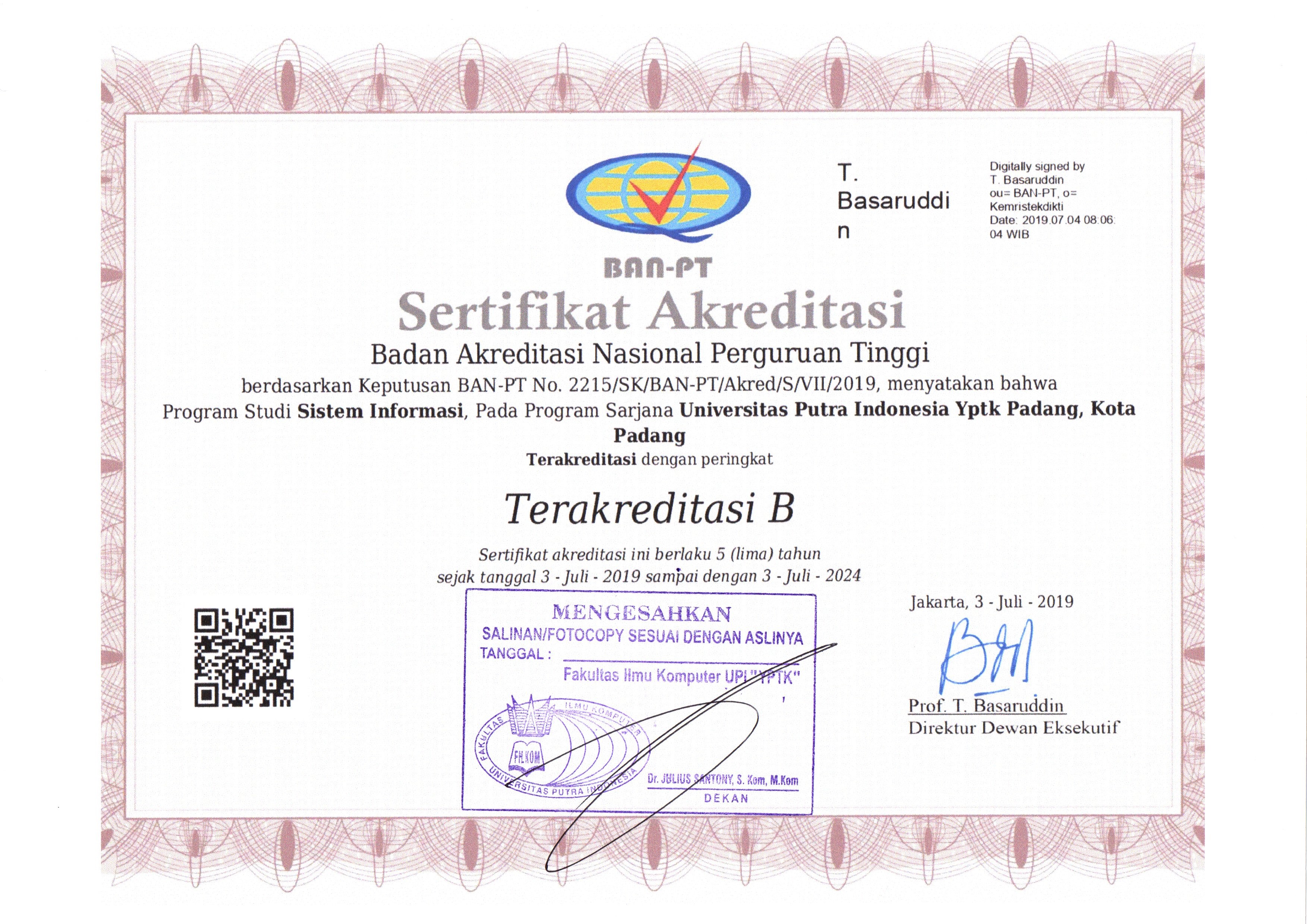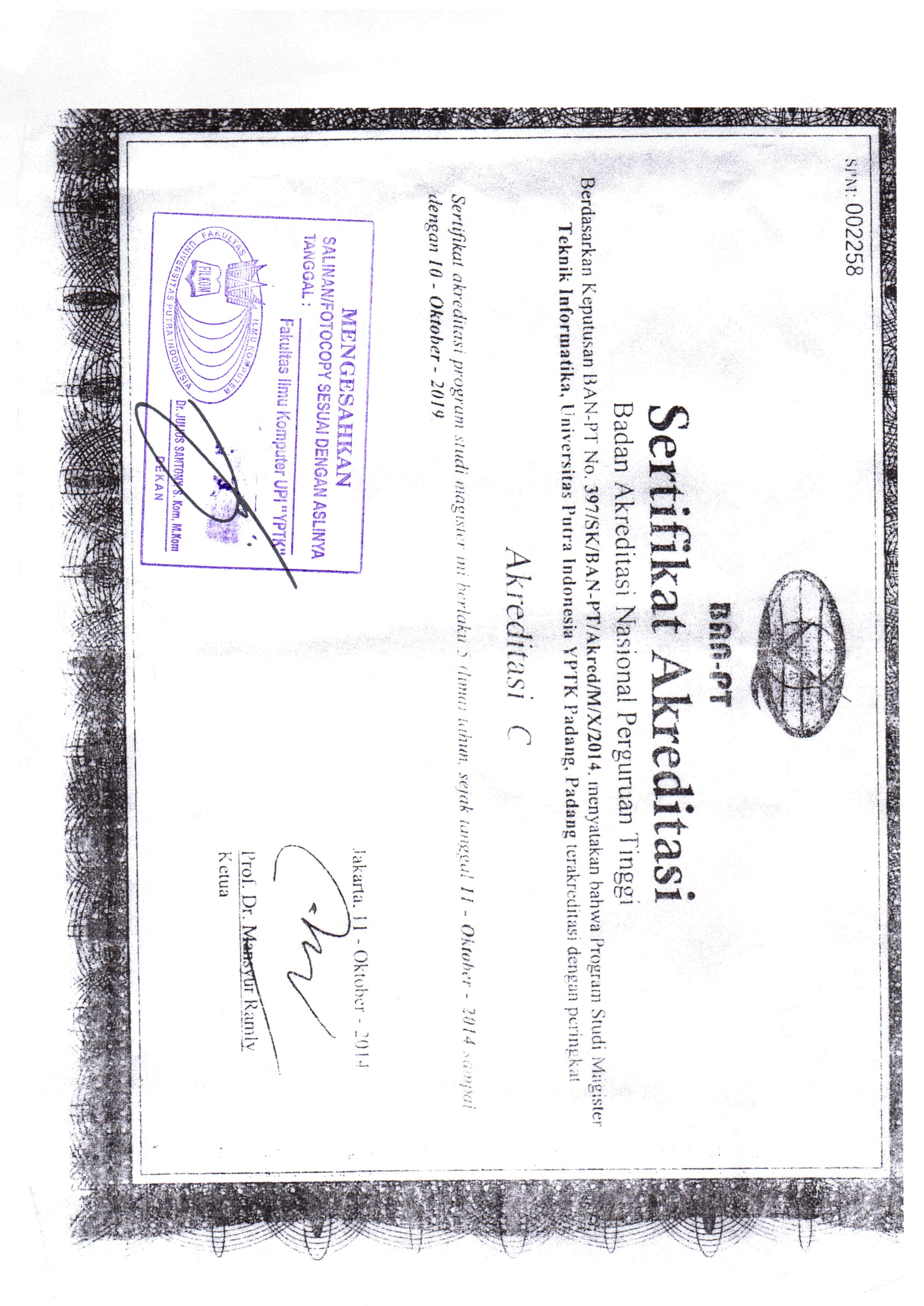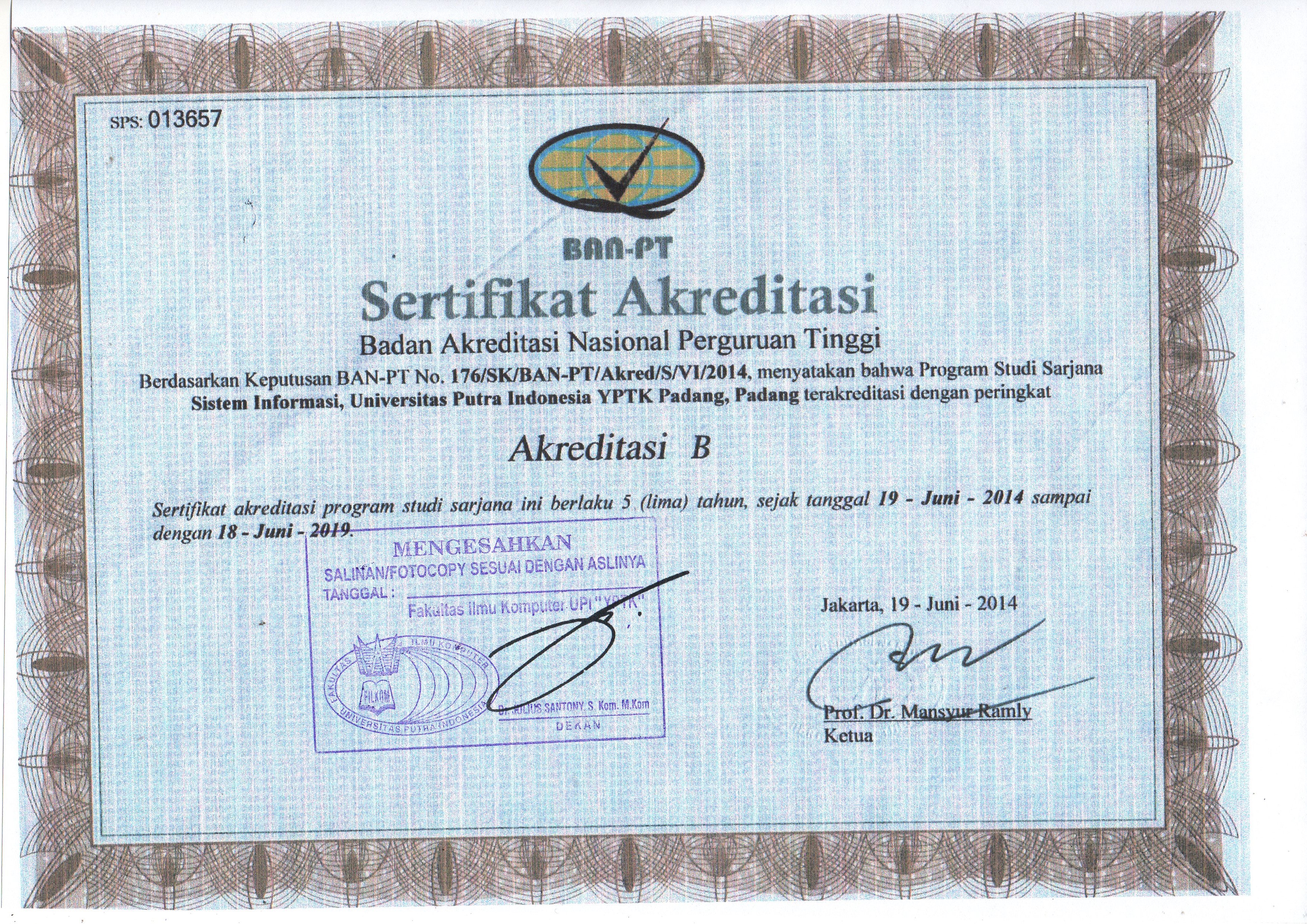 Sertifikat Akreditasi - Universitas Putra Indonesia (YPTK) Padang