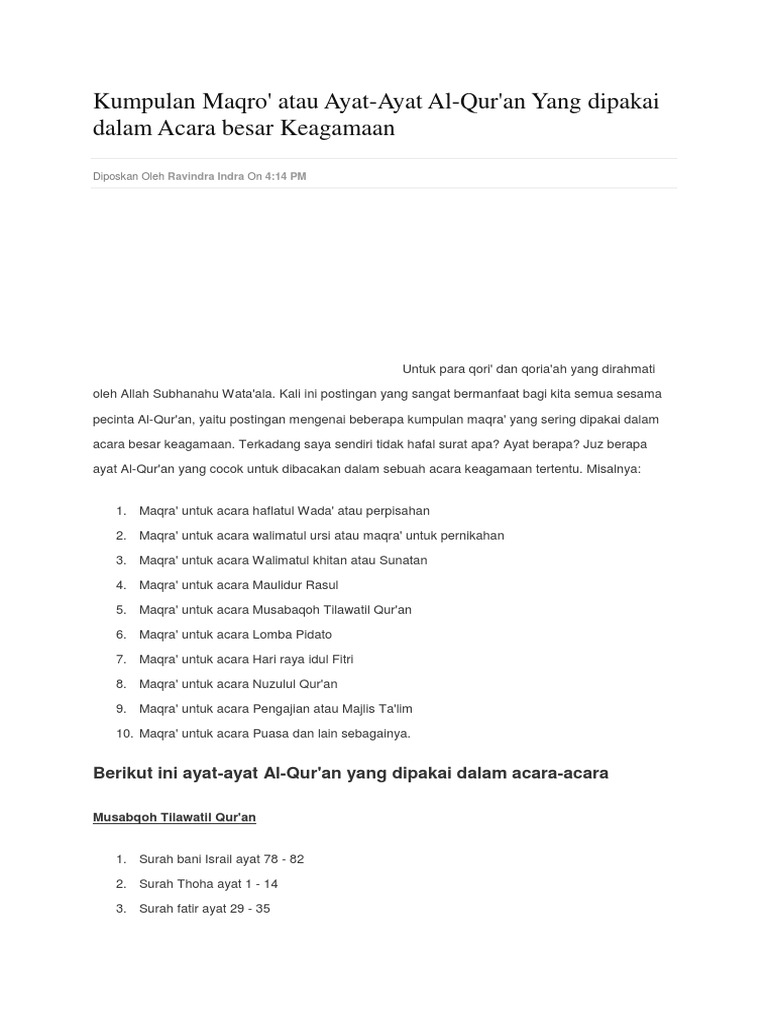 Kumpulan Maqro’ atau Ayat-Ayat Al-Qur’an Yang dipakai dalam Acara …