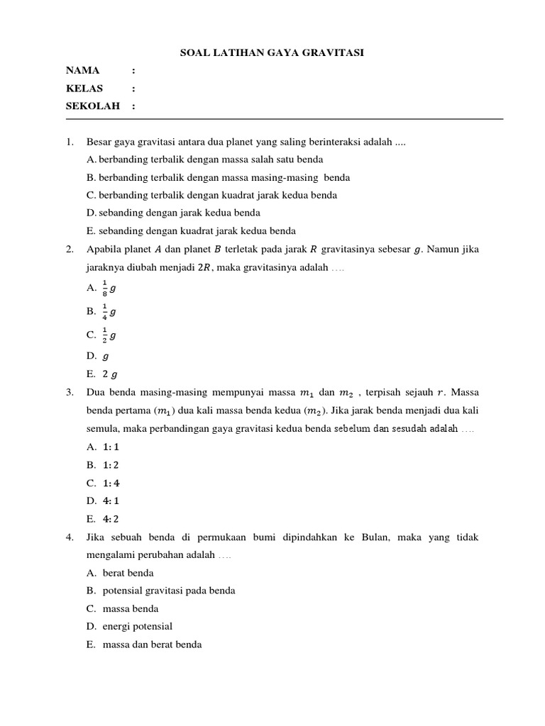 Soal Latihan Gaya Gravitasi Nama: Kelas: Sekolah