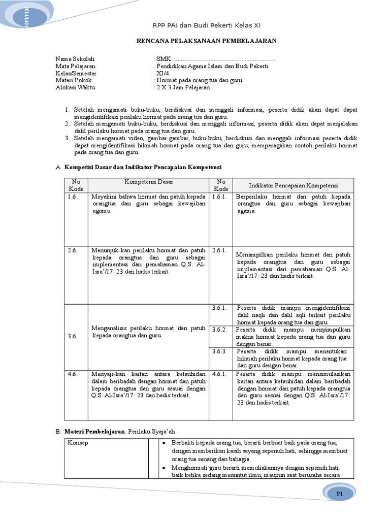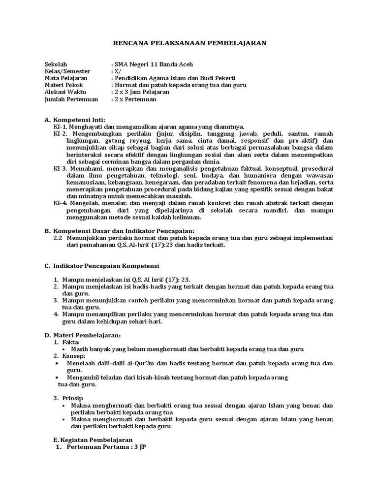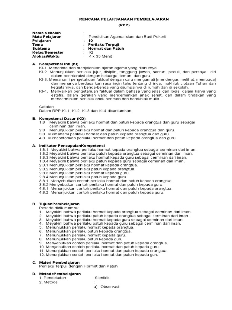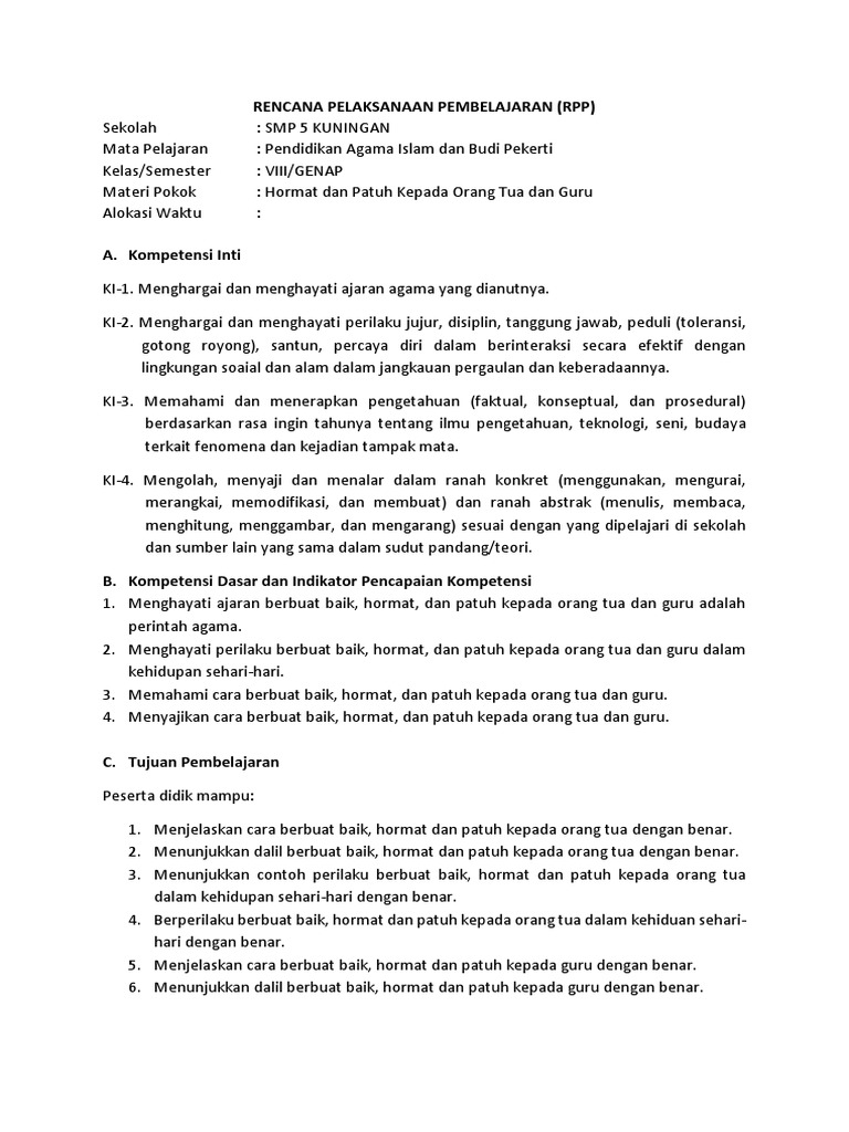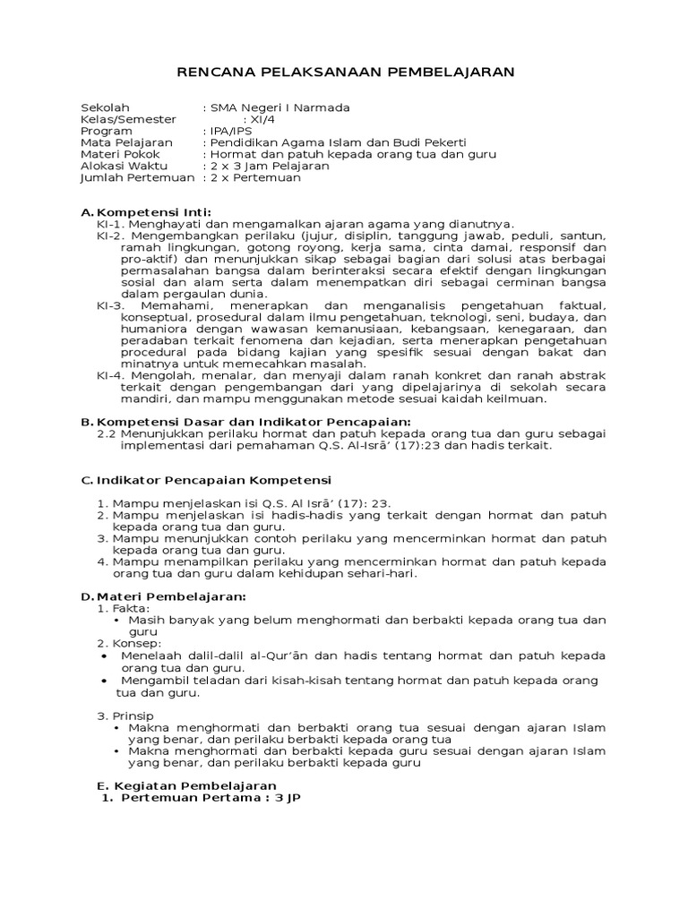 Rpp pai kelas iv semester 1 akhlak terpuji, hormat kepada orang tua, …