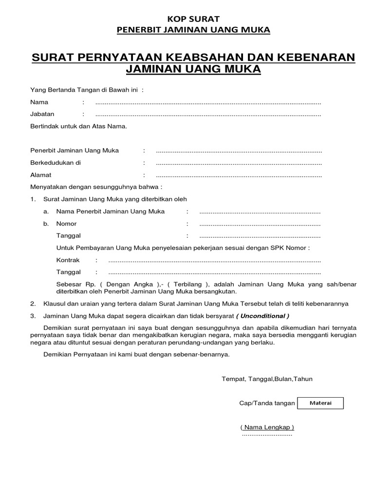 Surat Pernyataan Keabsahan Dan Kebenaran Jaminan Uang Muka