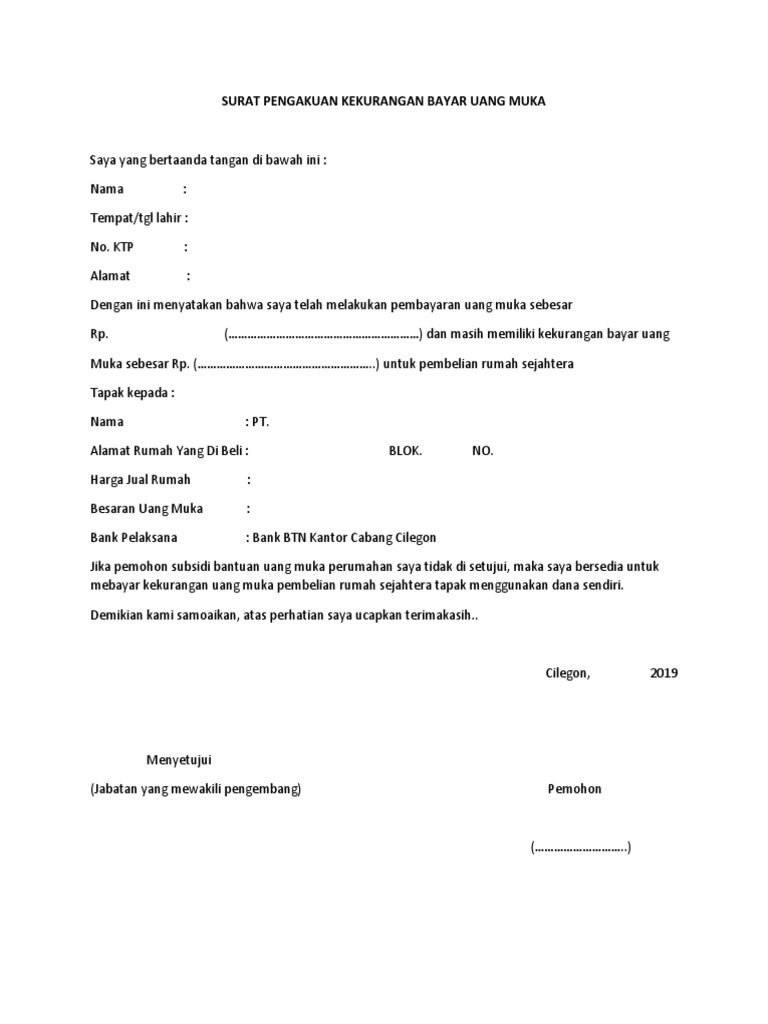Surat Pengakuan Kekurangan Bayar Uang Muka