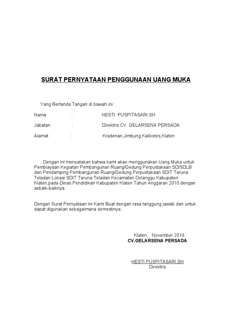 Ini Contoh Draft Surat Pernyataan Pembayaran Uang Muka Pembelian …