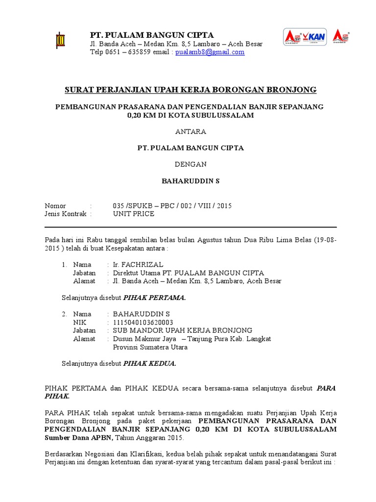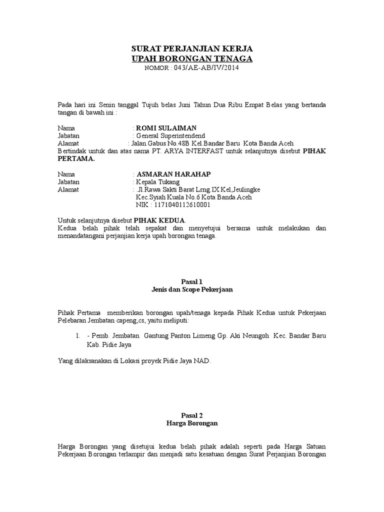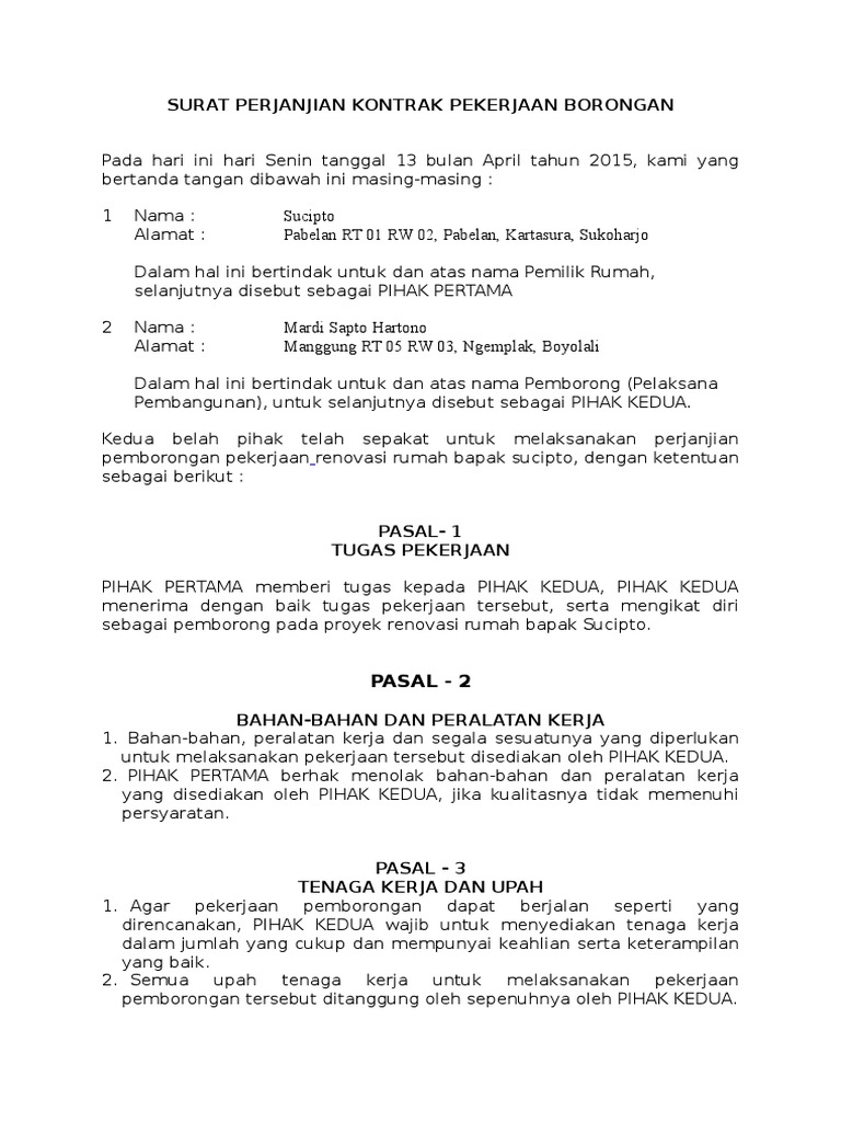 Contoh Surat Kontrak Kerja Upah Borongan Tukang - Dapatkan Contoh
