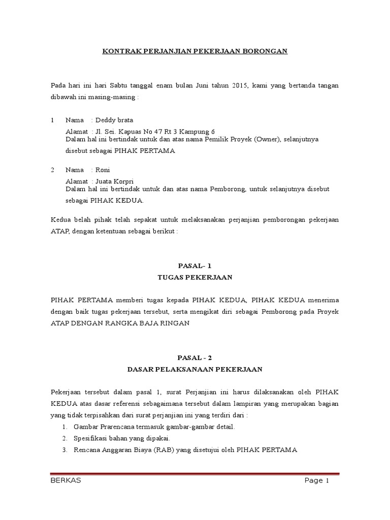 DOC) SURAT KONTRAK PERJANJIAN PEKERJAAN BORONGAN 1 | suryanto trihartono - Academia.edu