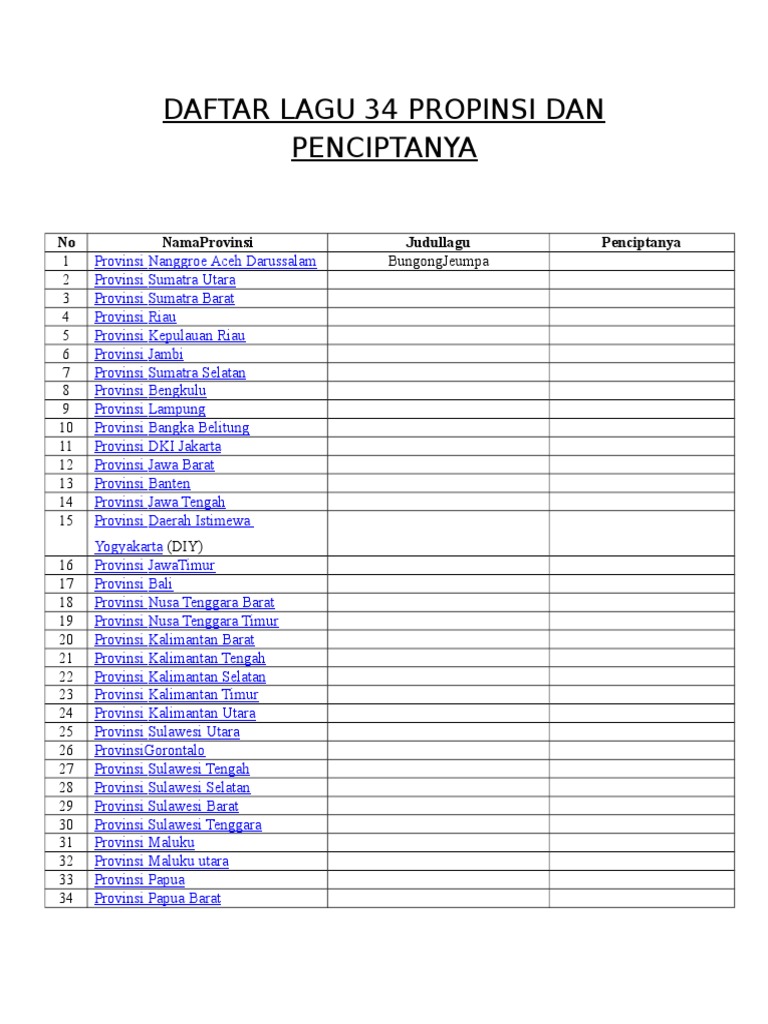 DOC) Daftar nama-nama lagu daerah 34 propinsi di Indonesia | Kevin …