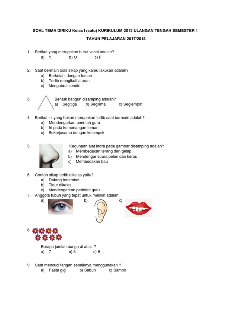 Soal Latihan UTS Tematik Kelas 1 Tema 1 Diriku Semester 1 …