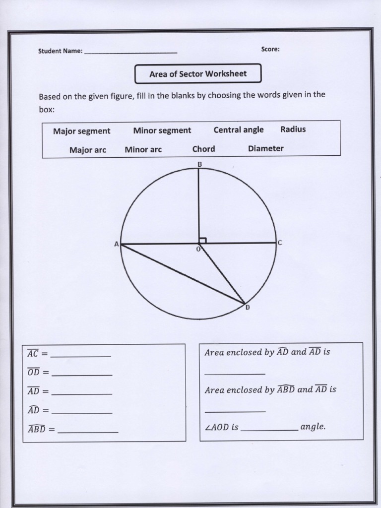 Area of Sector Worksheet: Based on the given figure, fill in the …