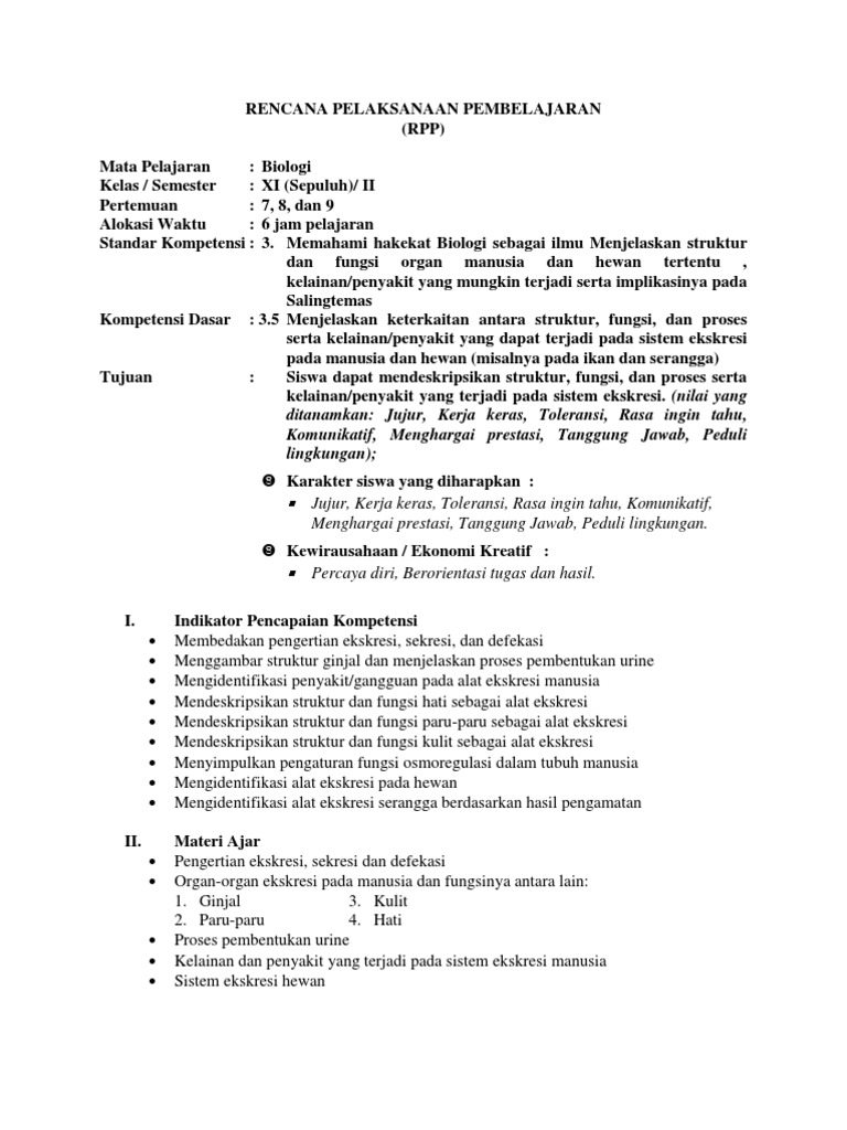 Rencana Pelaksanaan Pembelajaran Sistem Ekskresi
