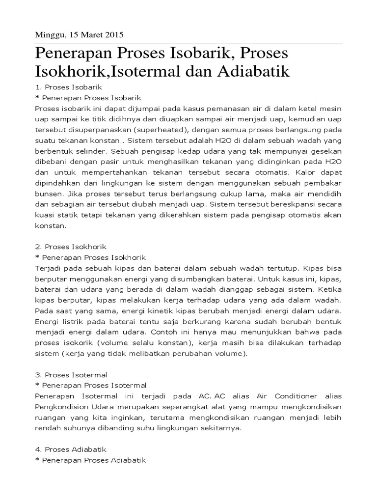Penerapan Proses Isobarik, Proses Isokhorik,Isotermal Dan Adiabatik