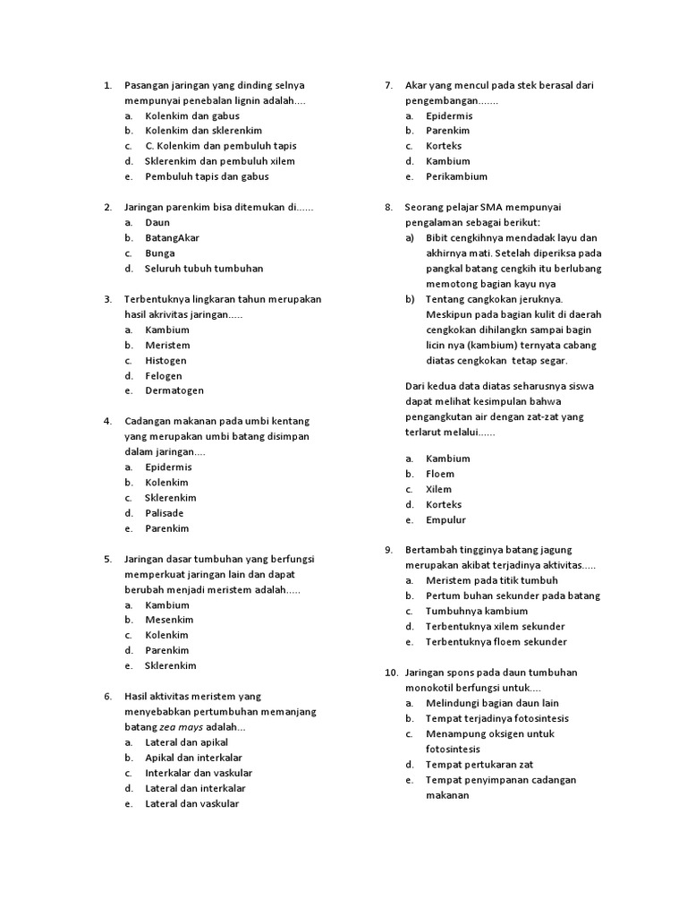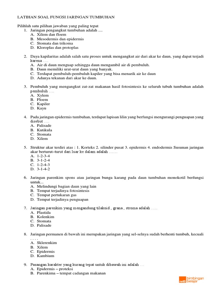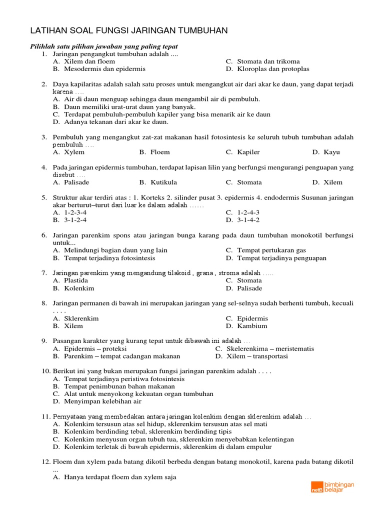 Latihan Soal Fungsi Dan Jaringan Tumbuhan Kelas 8 SMP