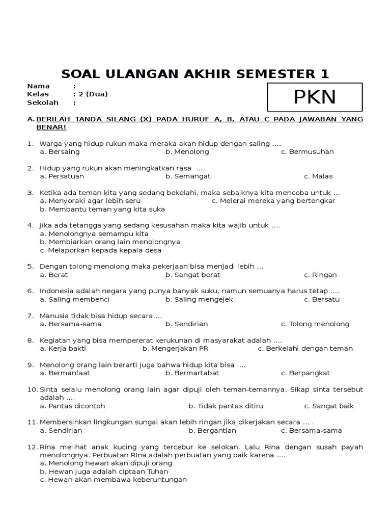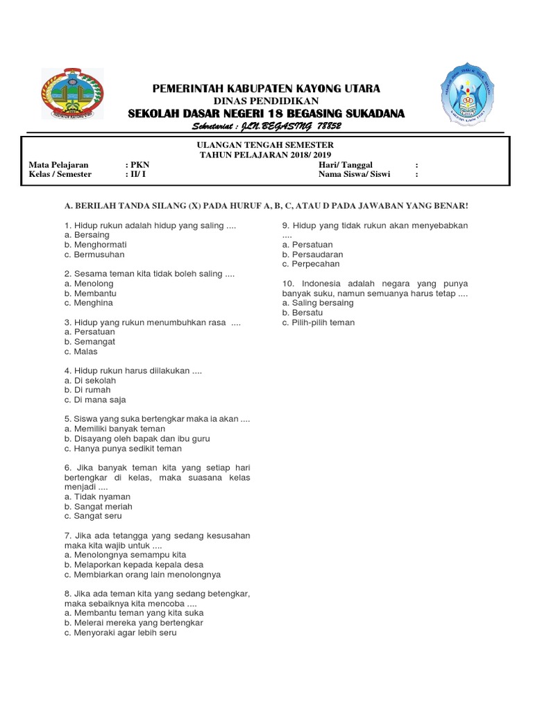 Soal UAS PKN Kelas 2 SD Semester 1 (Ganjil)