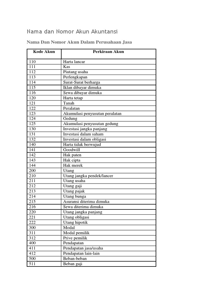 DOC) DAFTAR NOMOR/KODE DAN NAMA AKUN DALAM PERUSAHAAN JASA | Ai …