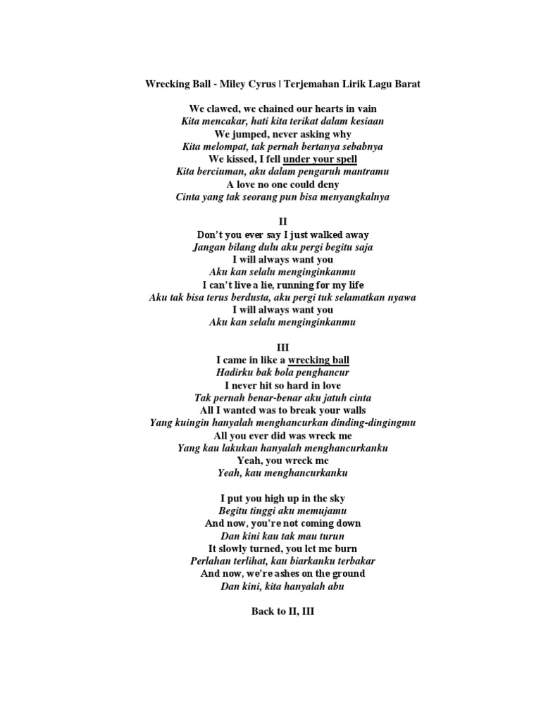 Lirik lagu miley cyrus wrecking ball bahasa indonesia …