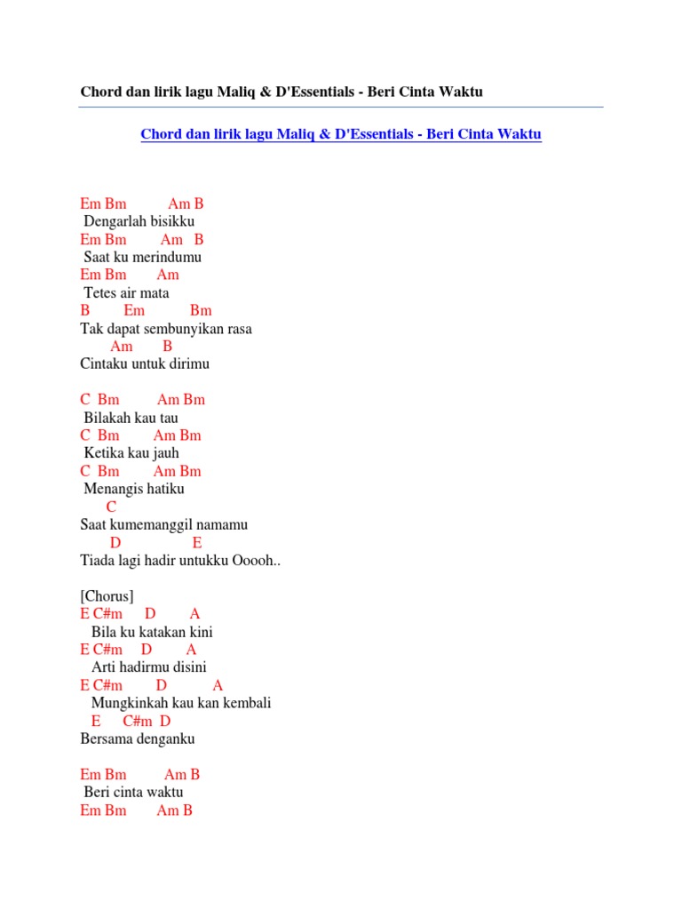 Chord Dan Lirik Lagu Maliq & D’Essentials - Beri Cinta Waktu
