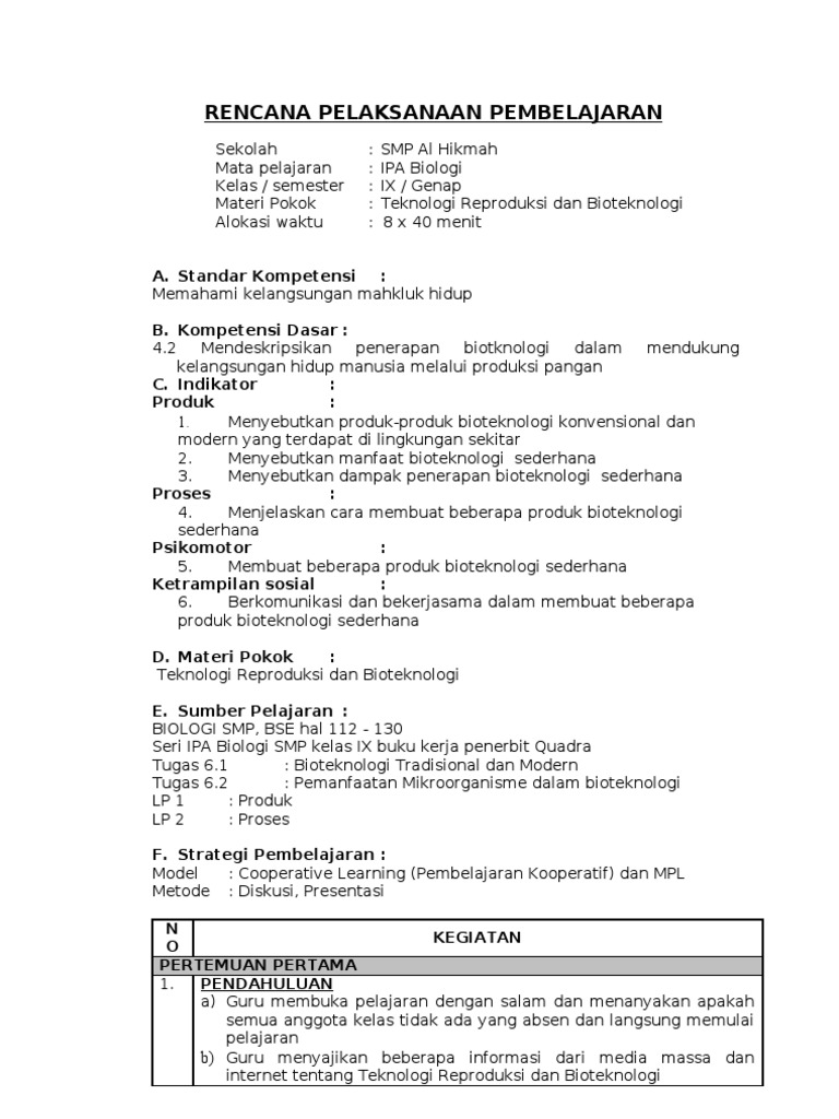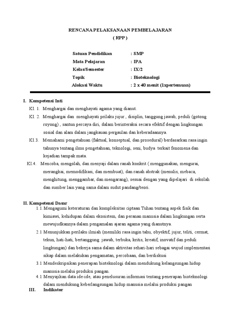 RPP SMP 4 IPA Kelas IX Bioteknologi