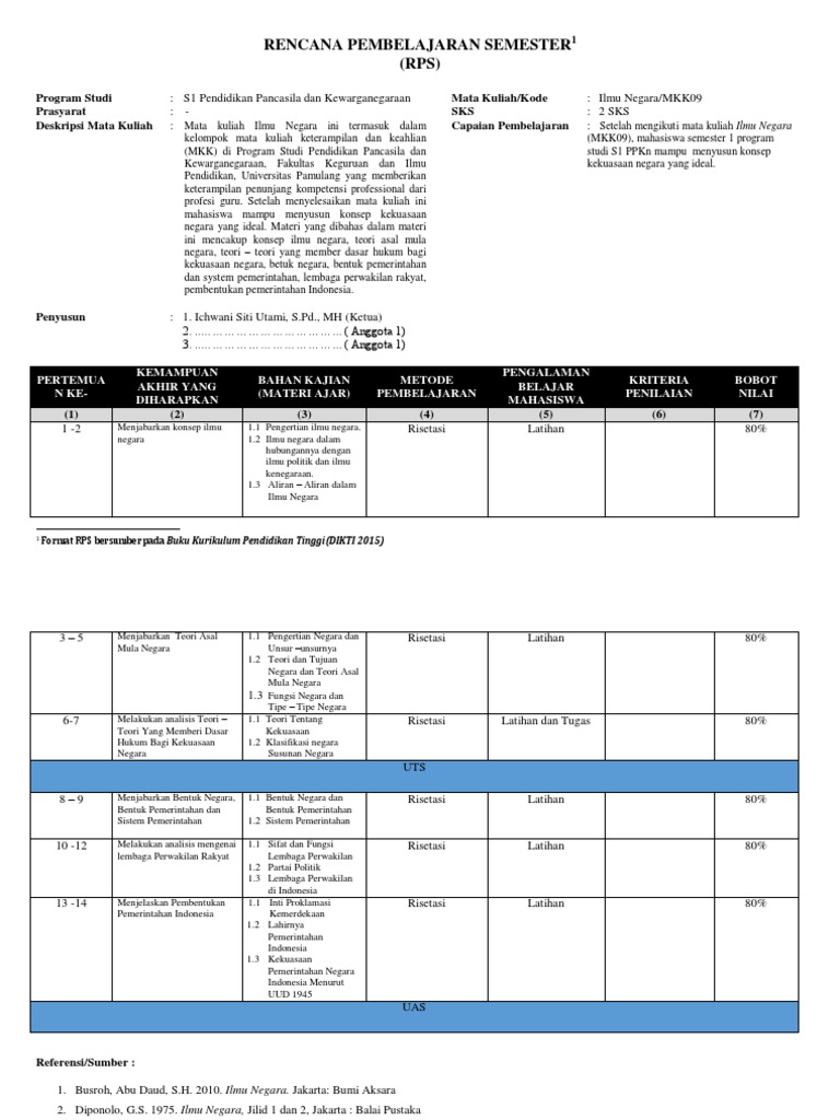 RENCANA PEMBELAJARAN Mata Kuliah : Ilmu Negara Semester: 1 (satu) Kode: MKK150103 Sks: 2 Program Studi : Hukum Dosen: Alfre