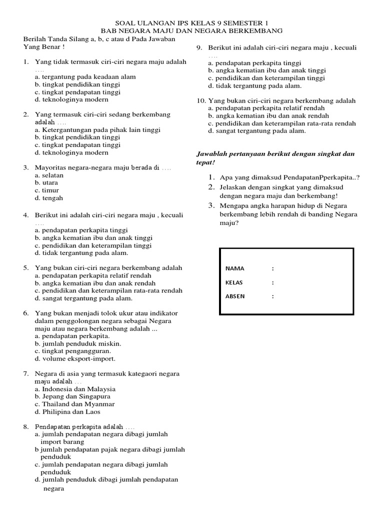 Soal UH IPS 9 smt 1 Negara Maju dan Berkembang