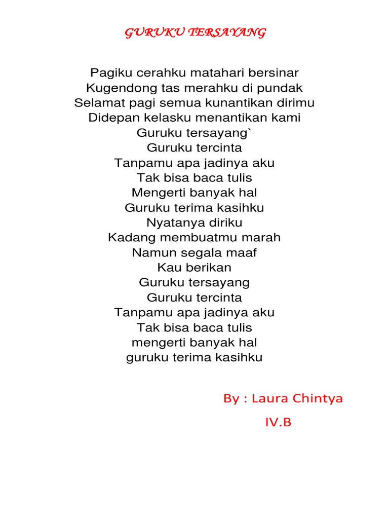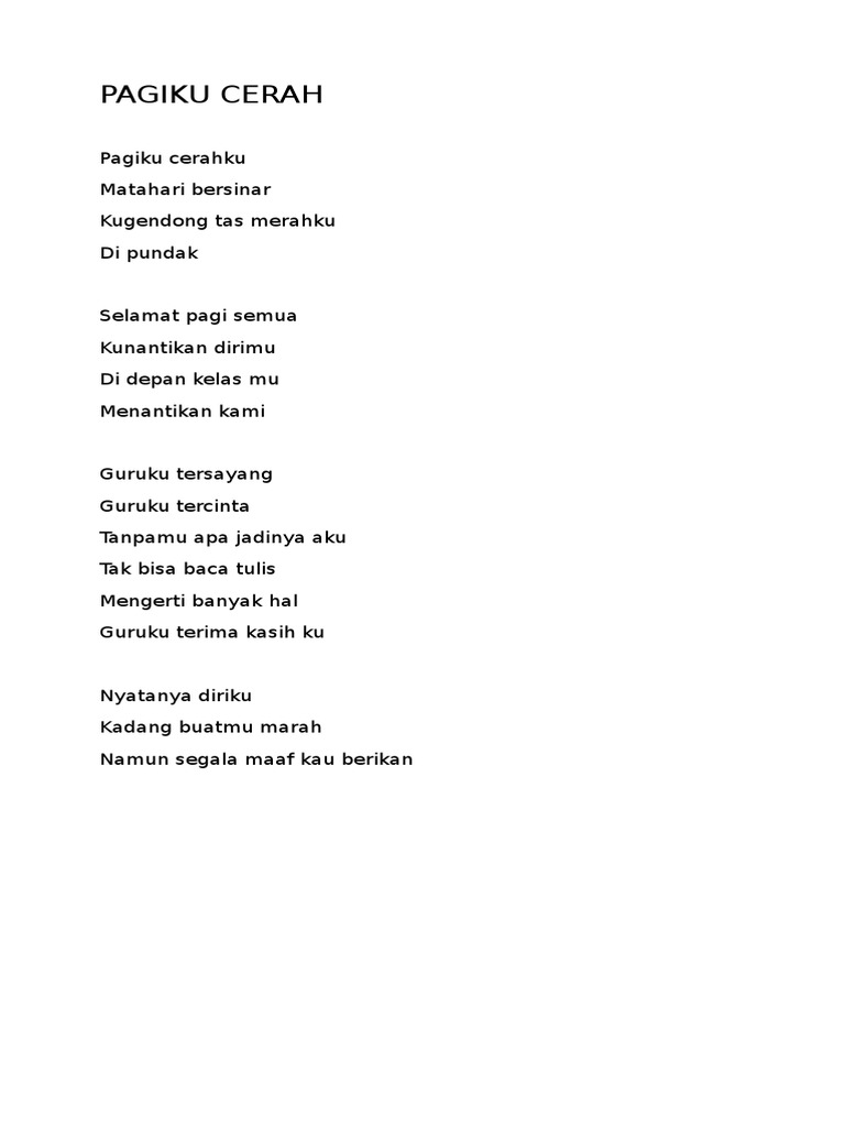 Lirik Lagu Guru Tersayang Pagiku Cerahku Matahari bersinar kugendong tas merahku di pundak Selamat pagi semua kunantikan dirimu di depan k… | Lirik lagu, Guru, Lagu