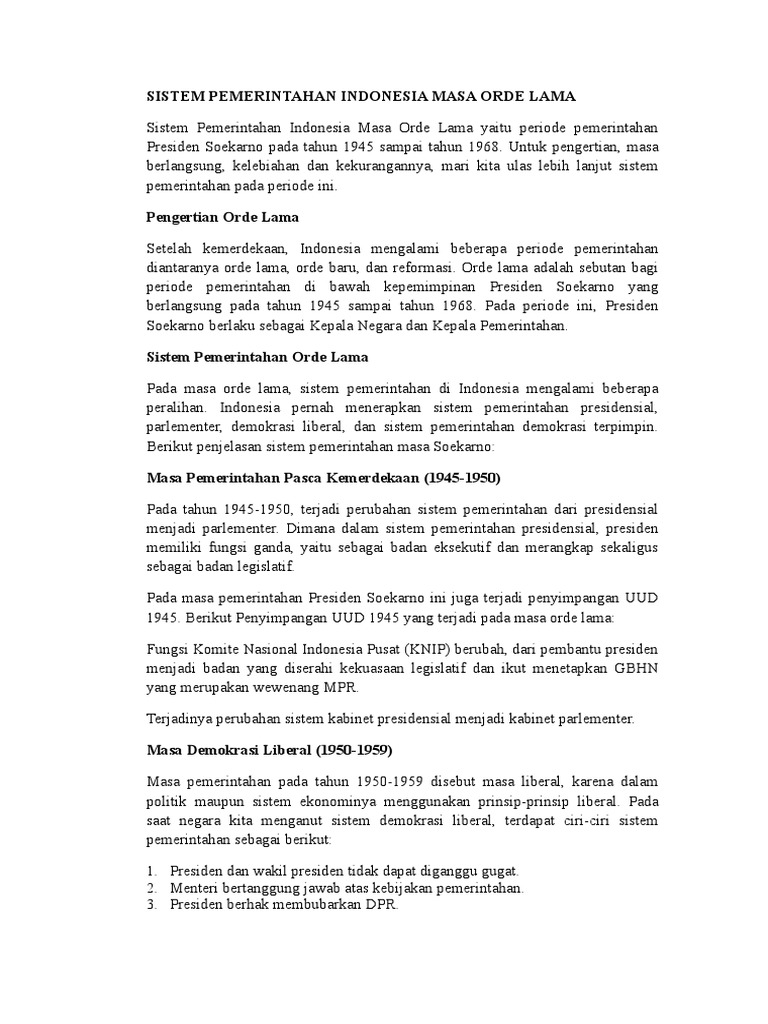 ORDE LAMA.doc - BAB I PENDAHULUAN A Latar Belakang Orde Lama adalah sebutan bagi masa pemerintahan Presiden Soekarno di Indonesia Orde Lama berlangsung | Course Hero