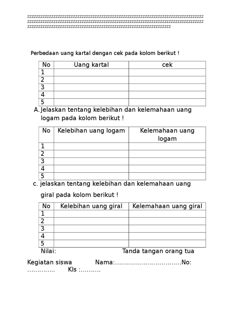 Perbedaan uang kartal dengan cek pada kolom berikut !