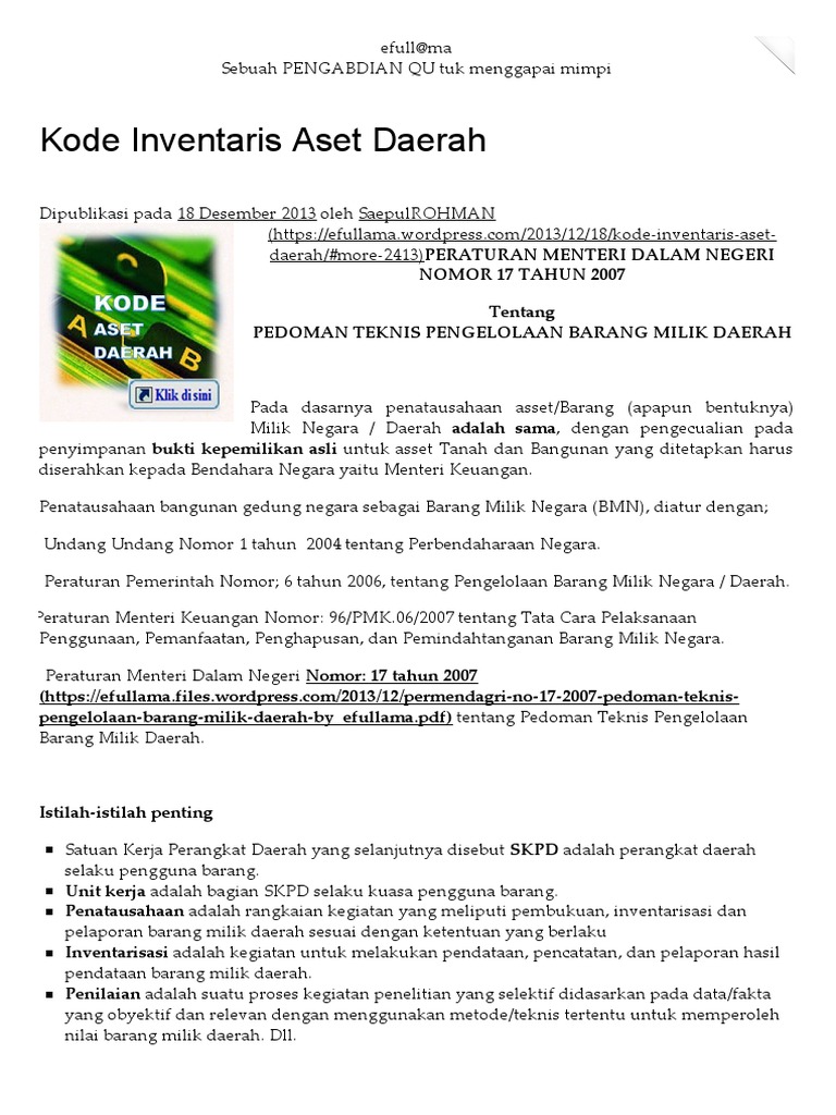 Peraturan Menteri Dalam Negeri No. 17 Tahun 2007 dan Lampiran Permendagri Nomor 17 Tahun 2007 Tentang Pedoman Teknis Pengelolaan Barang Milik Daerah | ridwan azri