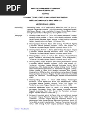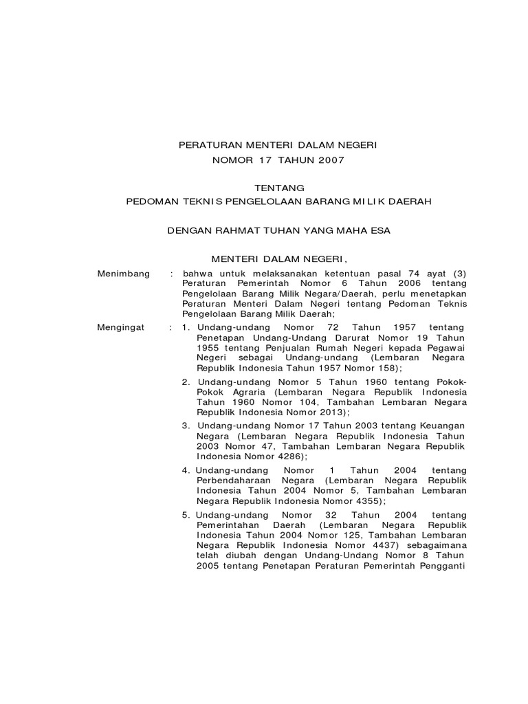 PERATURAN MENTERI DALAM NEGERI NOMOR 17 TAHUN 2007 TENTANG PEDOMAN TEKNIS PENGELOLAAN BARANG MILIK DAERAH DENGAN RAHMAT TUHAN YANG MAHA ESA - PDF Download Gratis