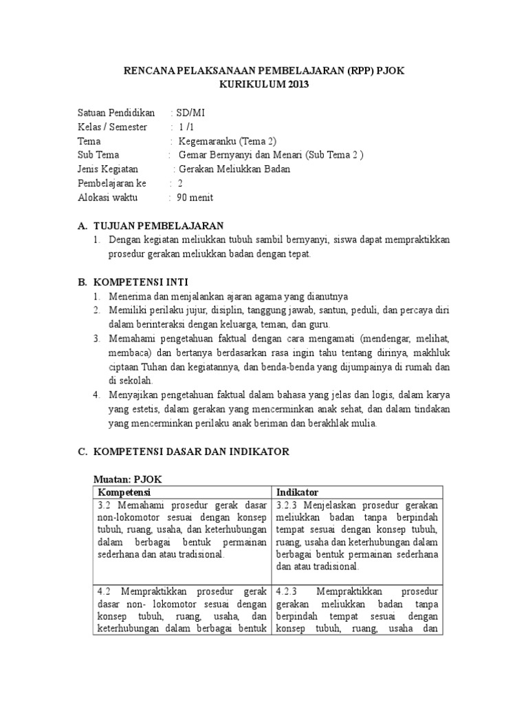 1.2.2.2. Gemar Bernyanyi dan Menari.doc - RENCANA PELAKSANAAN PEMBELAJARAN(RPP KURIKULUM 2013 Satuan Pendidikan Kelas Semester Tema Sub Tema | Course Hero