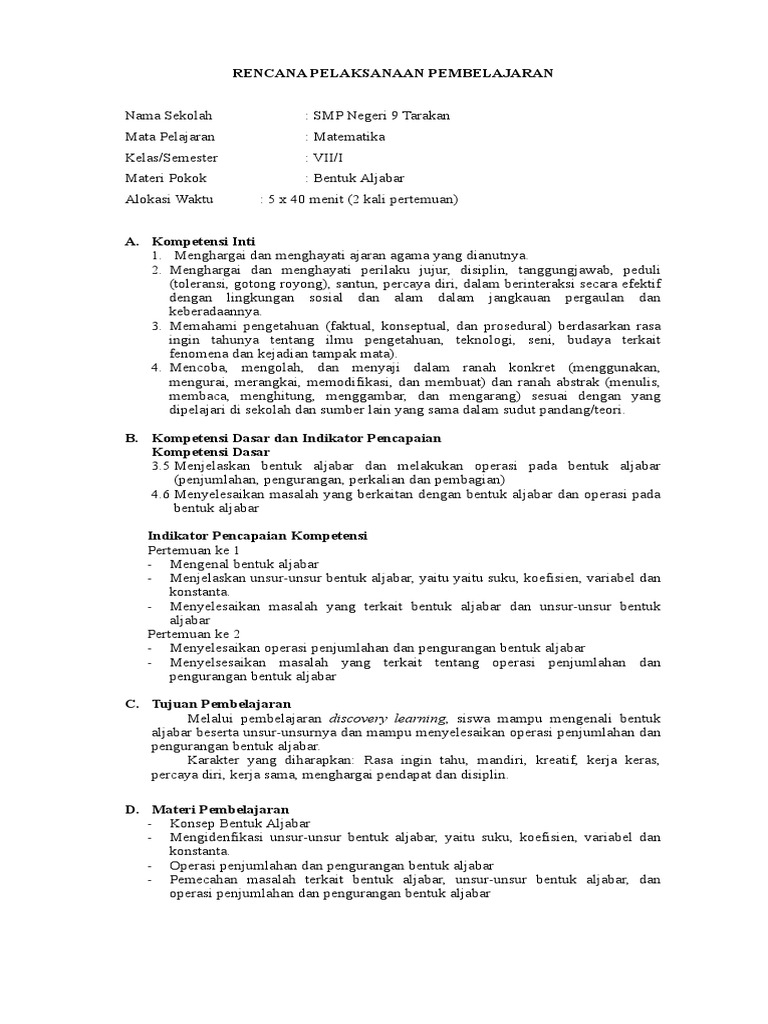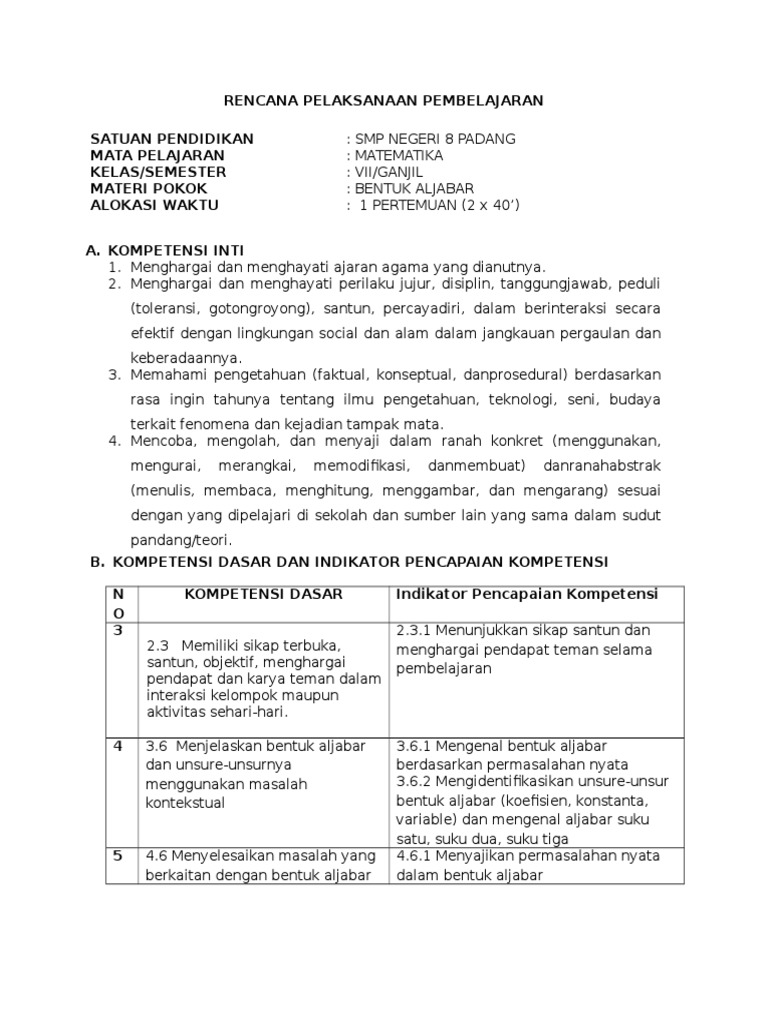 Rpp Bentuk Aljabar Kelas 7 Kurikulum 2013 Doc - Seputar Bentuk