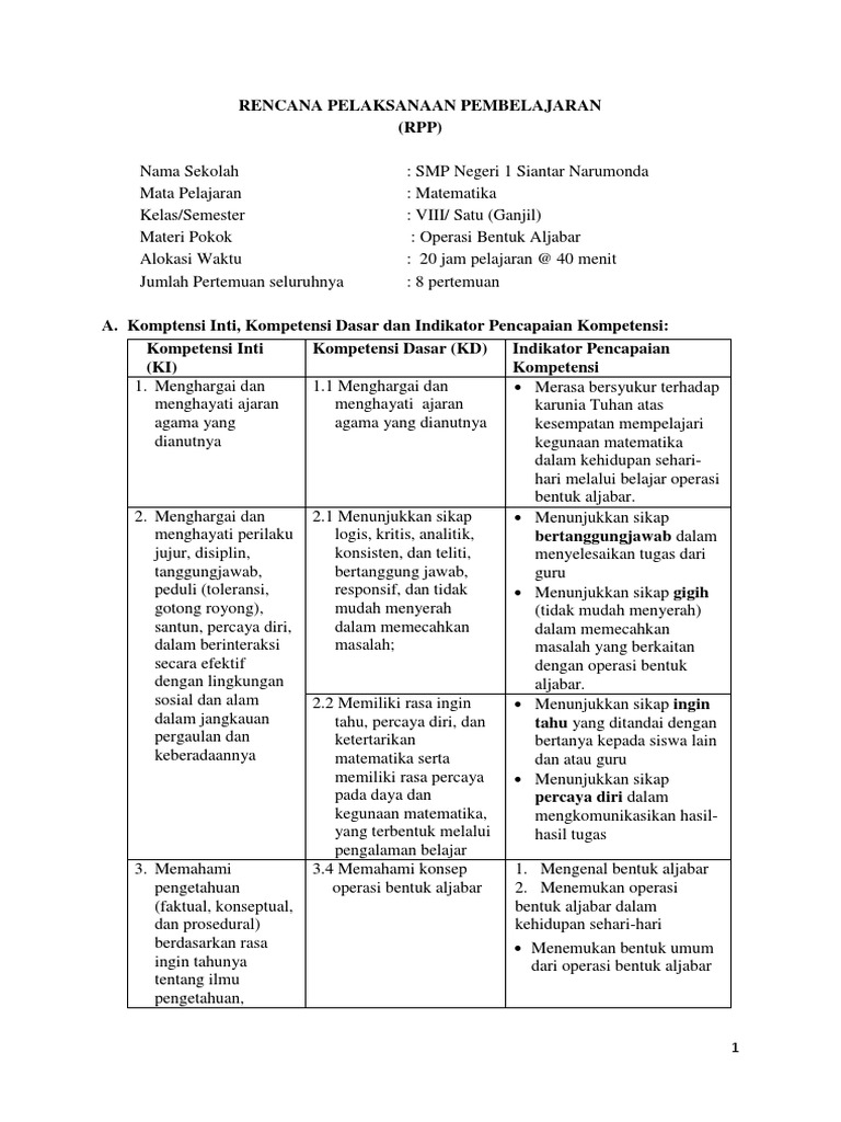 RENCANA PELAKSANAAN PEMBELAJARAN (RPP) OPERASI ALJABAR - PDF …