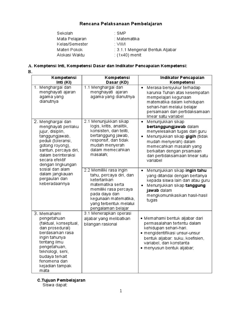 DOC) RPP Bentuk Aljabar Pert. 1.docx | Fifi Anggraeni, S.Pd …