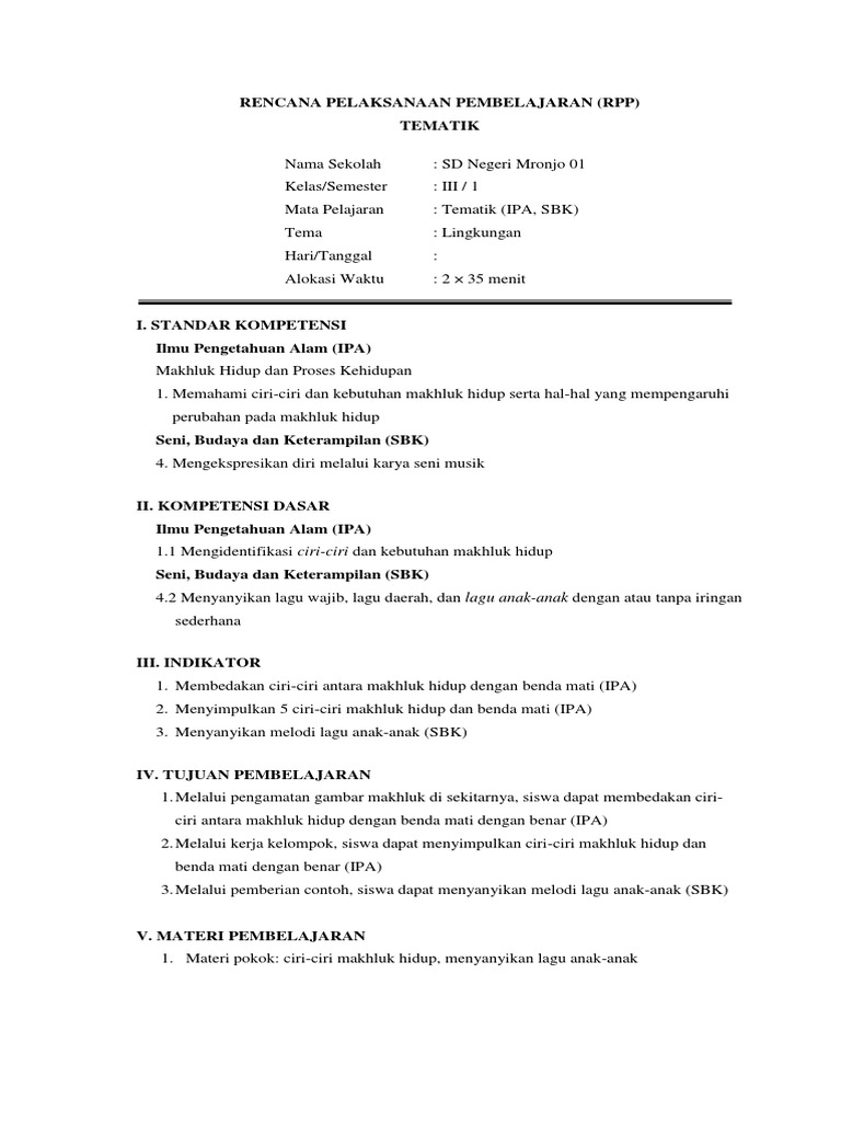 Contoh Rpp Tematik Kelas 3 Tema Lingkungan Dapatkan Contoh - Cute766