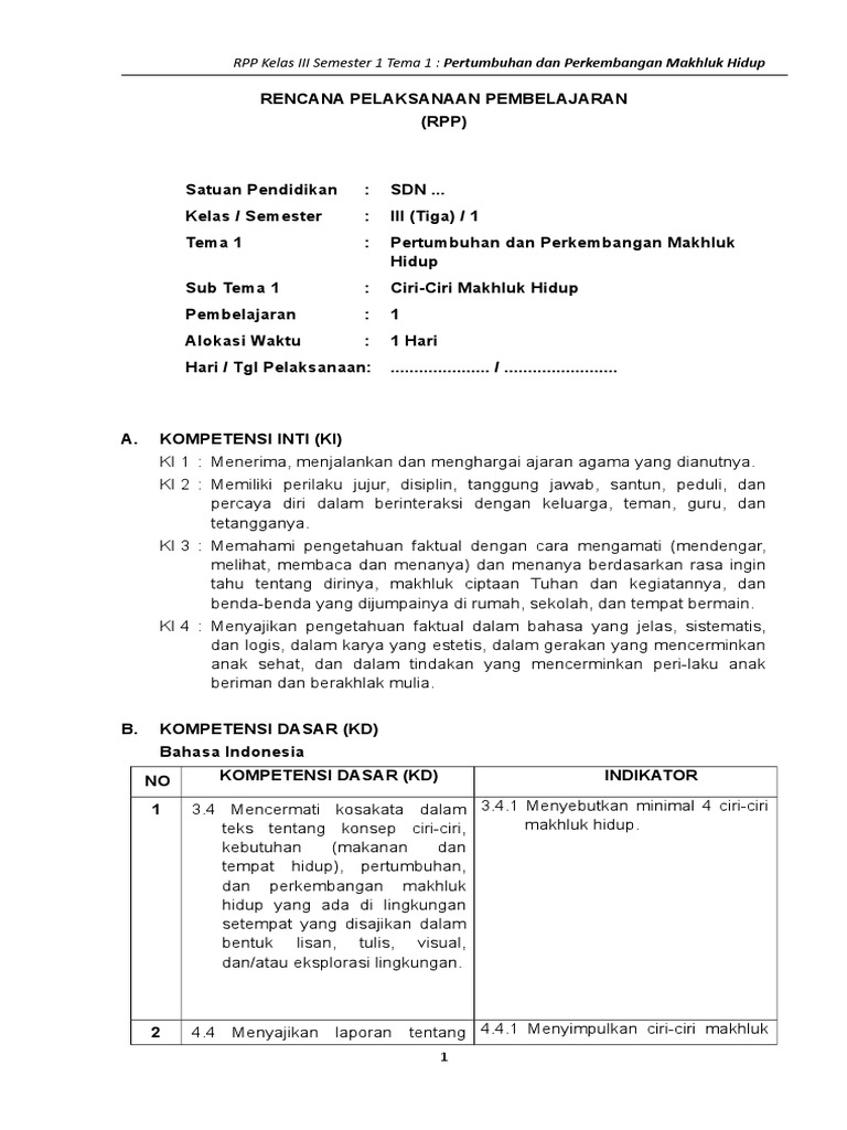 Rpp Kelas 3 Tema 1 Pertumbuhan Dan Perkembangan Makhluk Hidup …