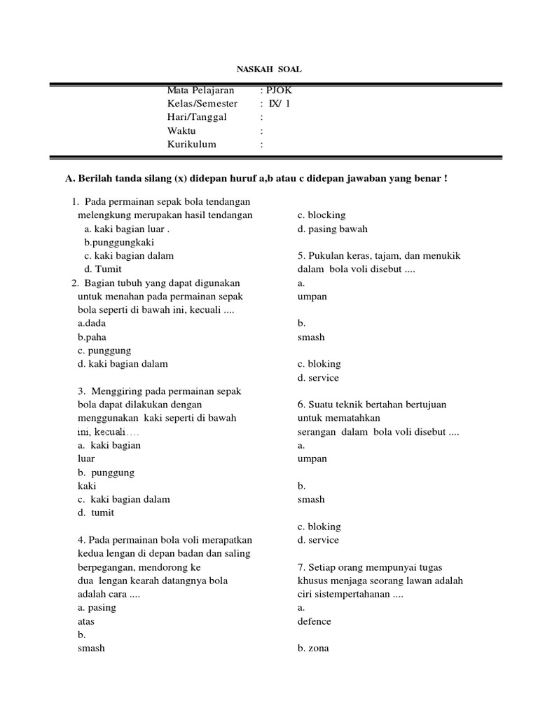 Lengkap - 45+ Contoh Soal UTS Penjaskes Kelas 9 SMP/MTs Semester …