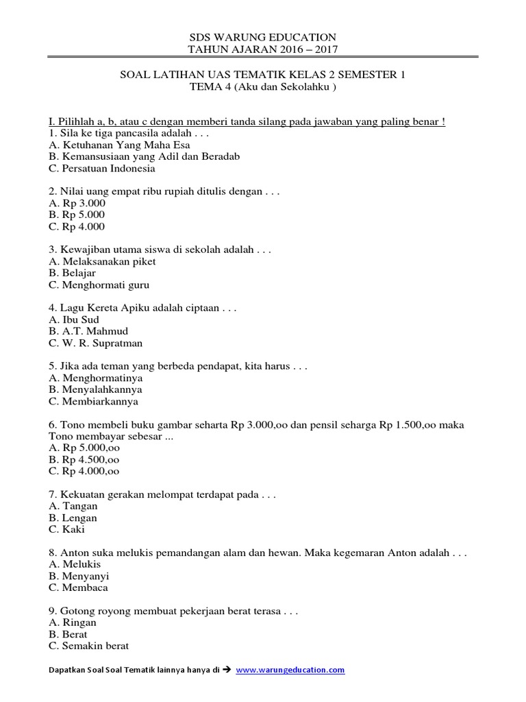Soal Uas Tematik Kelas 2 Tema 4 Semester 1