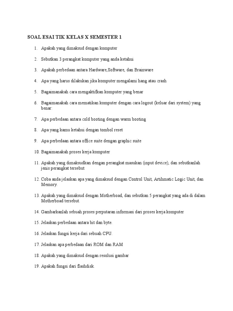 Soal Esai Tik Kelas x Semester 1