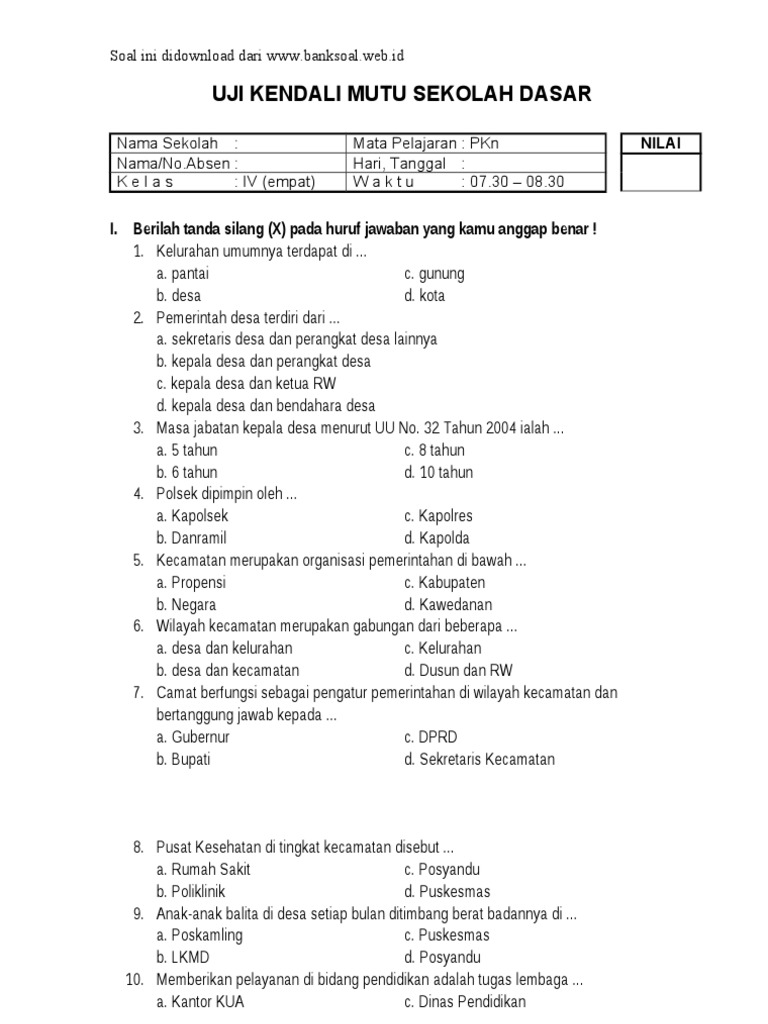 Soal Latihan UTS PKn Kelas 4 SD/MI Semester 2 - SekolahDasar.Net