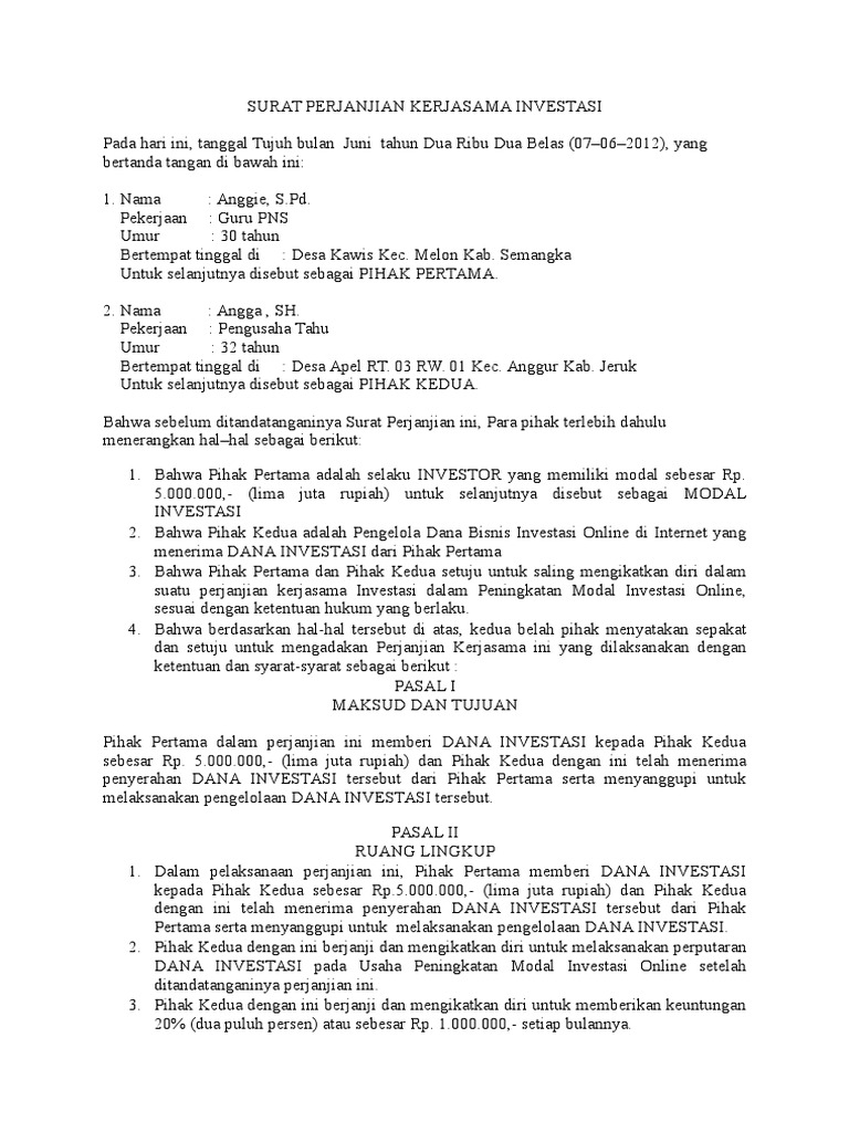 DOC) SURAT PERJANJIAN KERJASAMA INVESTASI | esti laras - Academia.edu