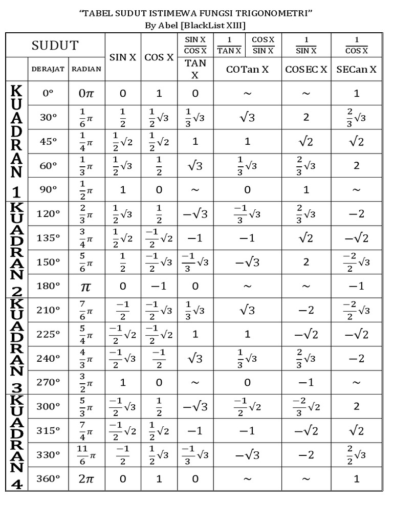 Tabel Sudut Istimewa Sin Cos Tan Cot Sec Cosec 0 Sampai 360 Trigonometri