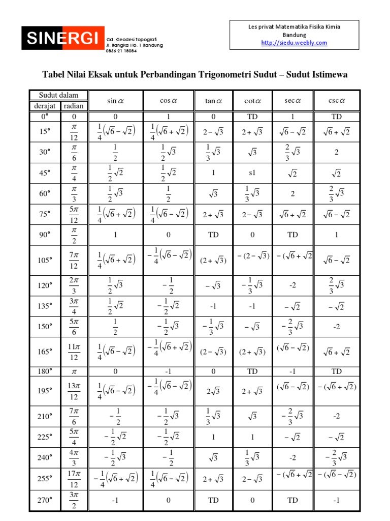 Tabel Trigonometri Sudut Istimewa Dalam Tabel