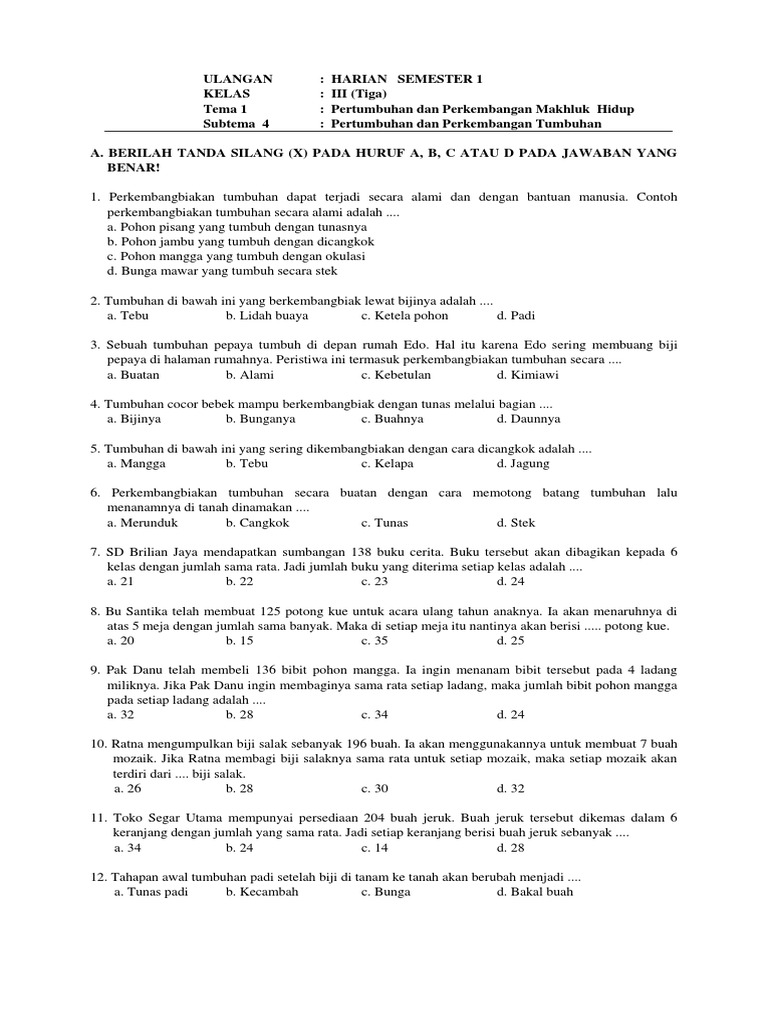 Lengkap - 30+ Contoh Soal UTS / PTS untuk kelas 3 SD/MI Tema 1 Sub …