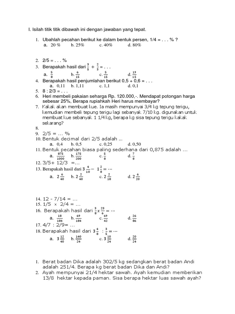 Contoh Soal Pecahan Desimal Dan Persen Kelas 5 Sd | Kumpulan Soal pelajaran 8